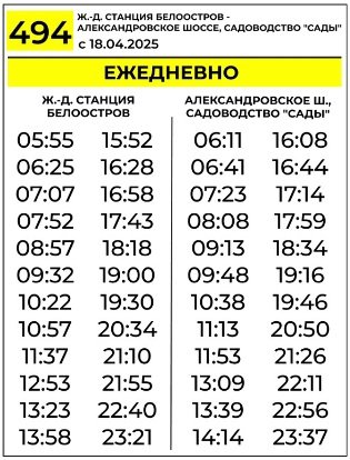 Расписание автобуса 494 существенно обновилось: http://orgp.spb.ru/raspisanie/1850/ Белоостров 6:00 6:35 7:05 7:40 8:23 8:58 9:28 10:19 11:30 12:10 12:45 13:15 (обед) 15:13 15:49 16:32 17:14 17:54 18:24 18:59 19:29 20:29 21:30 22:08 23:16 Обратно от 2 озера 6:16 6:51 7:21 7:56 8:39 9:14 9:44 10:35 ...