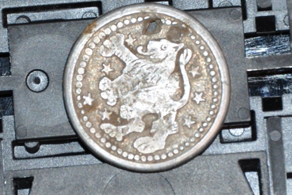 а вот и моя находочка! найдена не у нас а в Лодейнопольском районе, в огороде. Полистал инет. Лев - герольдический, Финский, но какой то неаккуратный, не как на пуговицах, да и звезды как то разбросаны не так, как положено! Дырка пробита, типа, как гвоздем, для ношения на веревочке, на шее. Есть мнения? Что Сие?