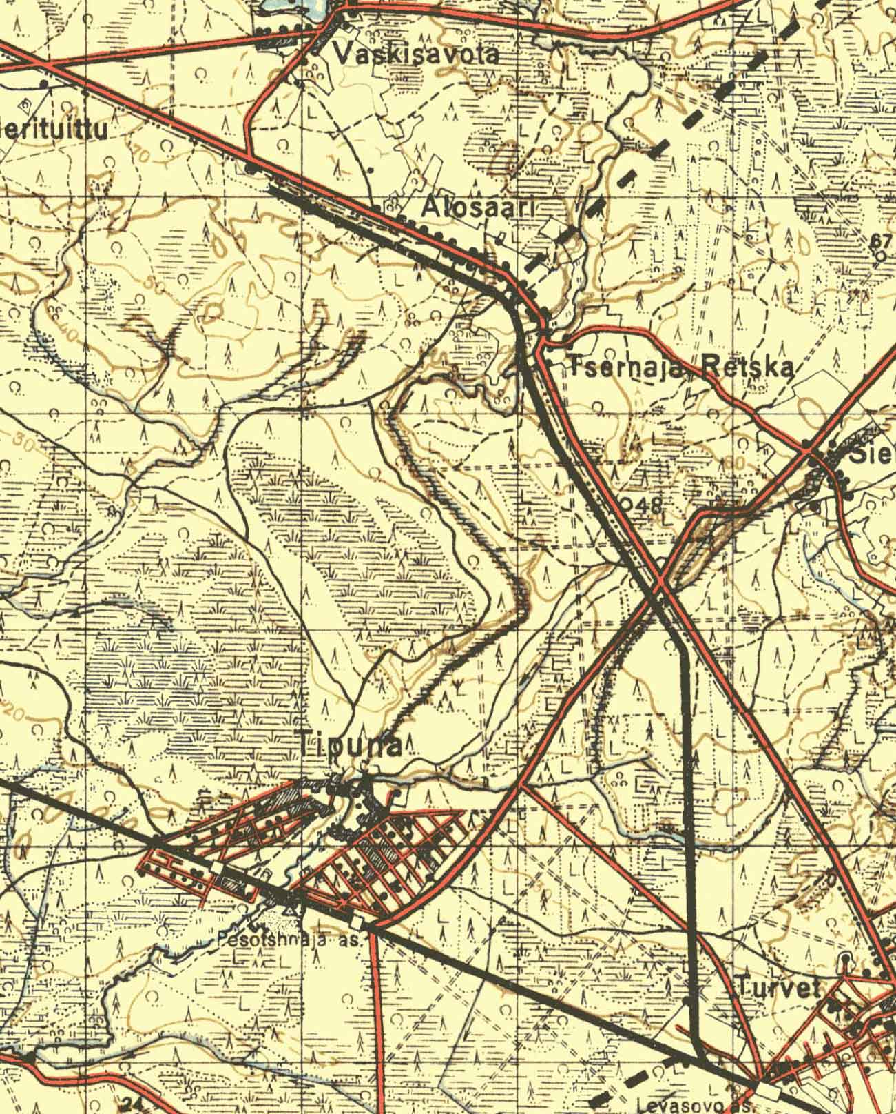 По поводу ширины колеи: на последней карте (фрагменте нашей, Р-36-133) дорога показана именно с широкой колеёй (ср. там же изображение узкоколеек в р-не тофяных разработок близ Парголово). М.б., как это бывало, её после войны перешили на узкую?