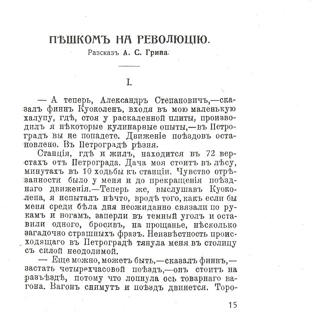 Предлагаю посетителям сайта полный текст рассказа Александра Сергеевича Грина "Пешком на революцию".(наст. фам. Гриневский. Отец поляк, потомственный дворянин. Мать русская, дочь колл. сов. В семье Гриневских было 9 братьев и сестер).
