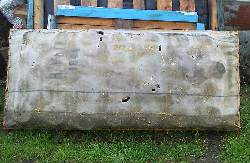 Решил тут разобрать-выбросить старую оттоманку, что с незапамятных времён на даче стояла. Совершенно неожиданно для себя обнаружил такую вот нижнюю обивку (низ, где каркас и пружины). Была мысль, что просто тряпку такую нашли и переобили. Но похоже, обивка штатная.