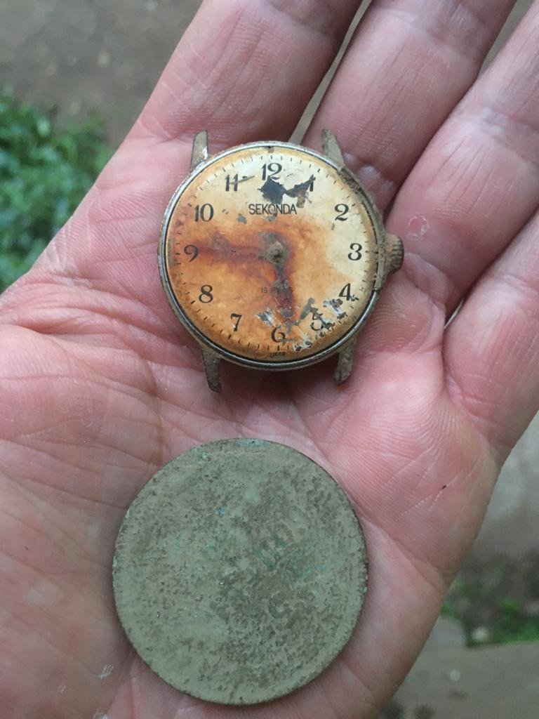 Из находок - у меня "день жбони", товарищ в ушах нашел пару мелких монет. Трава уже высокая.