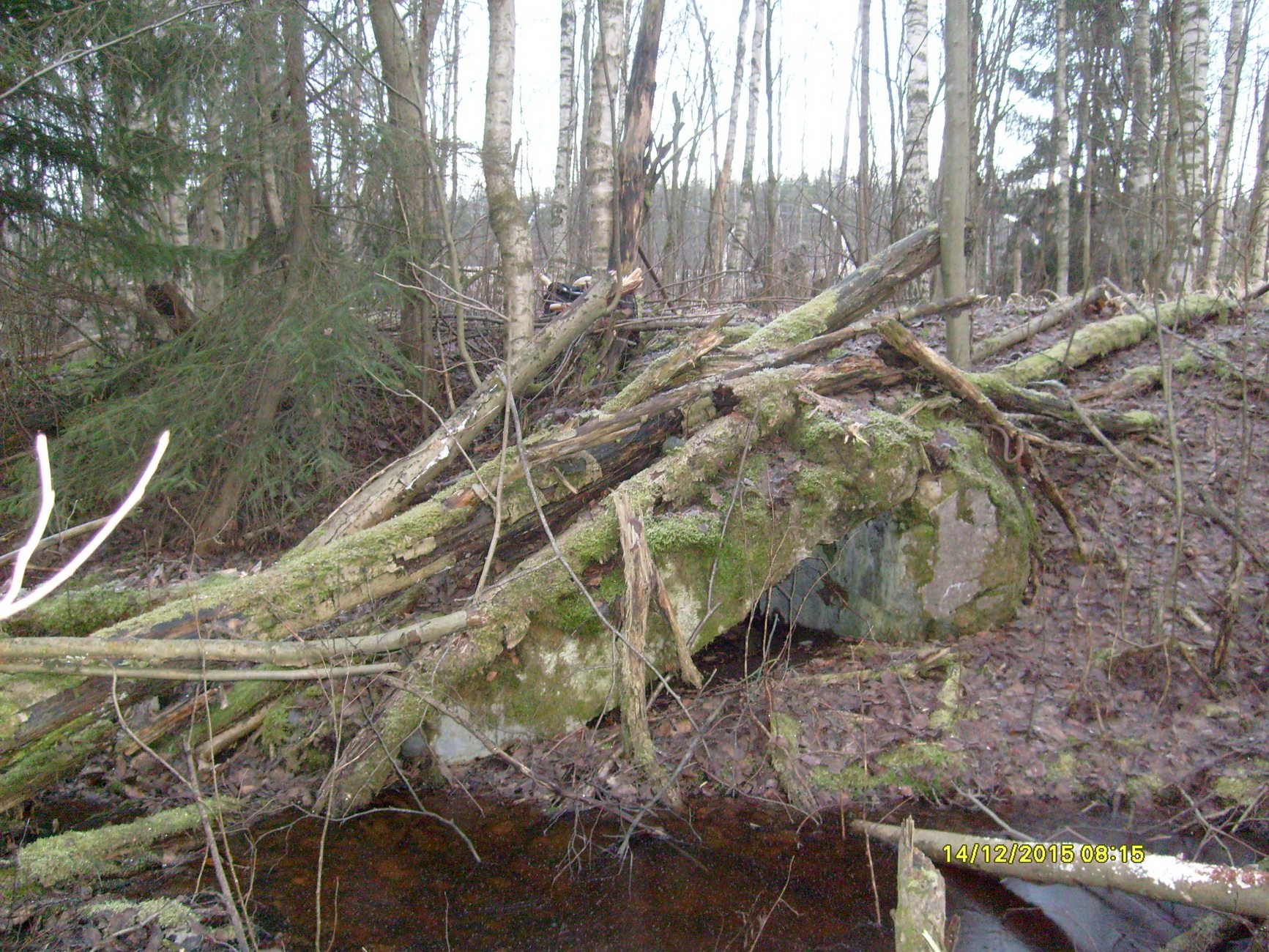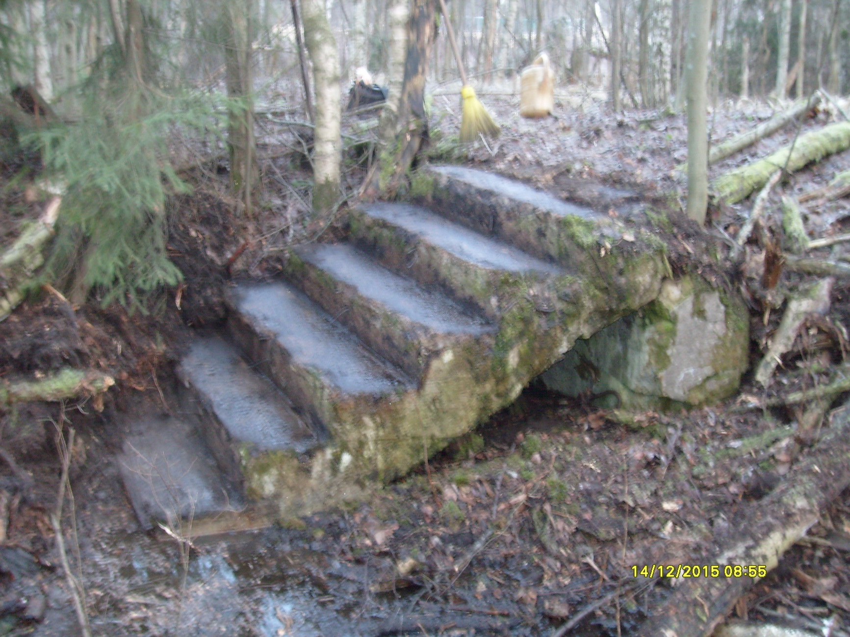 Местность сильно заболочена и сплошь заросла кустарником, а также трудно проходимым лесом. Пройти можно только в болотных сапогах и то не везде. Предполагал сделать фото зданий и разных фундаментов, т.к. без очистки от кустарника и пр. хорошего фото не сделать, то пришлось взять щуп минера, лопату, метелку, лейку.и пр.