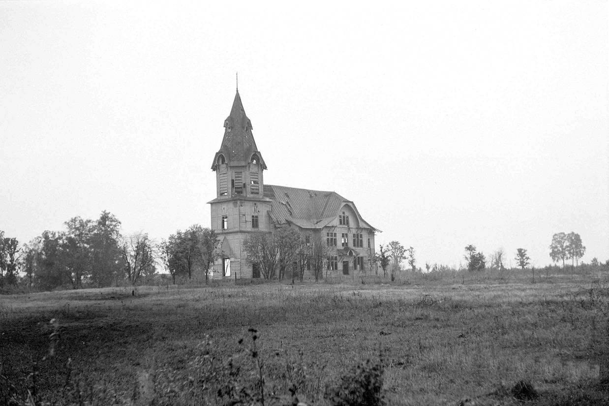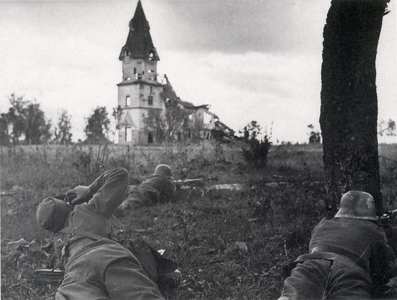 Все фото с солдатами - постановочные, сделанные 19.09.1941, и кирха уже разрушена, и домика тоже нет, он или разбит, или разобран.