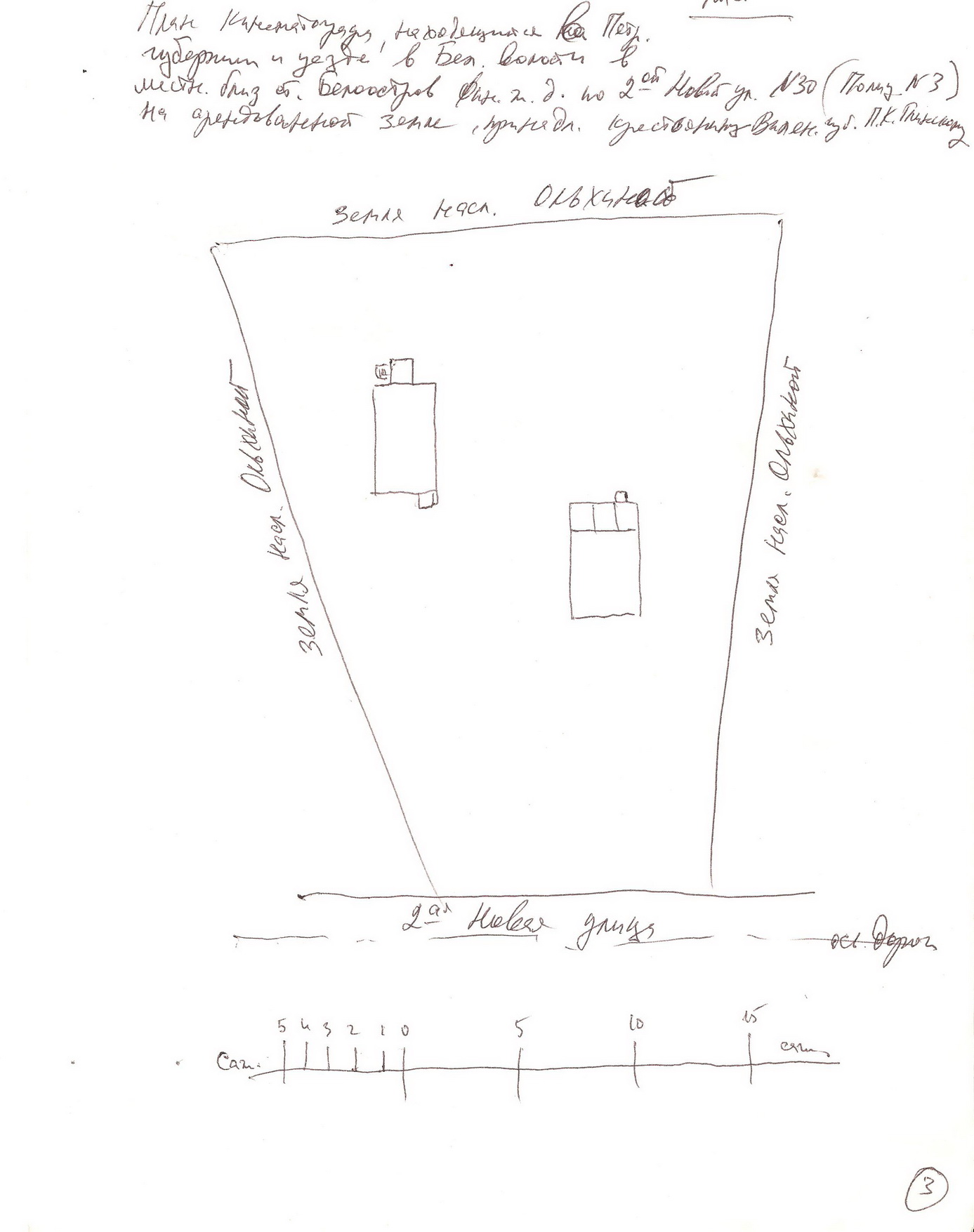 На представленном плане вверху сделана надпись "План кинематографа, находящегося в Петроградской губернии и уезде в Белоостровской волости в местности близ станции Белоостров Финл. ж.д. по 2-ой Новой улице №30 (Полиц. №3) на арендованной земле, принадлежащей крестьянину Виленской губернии П.К. Глинскому."