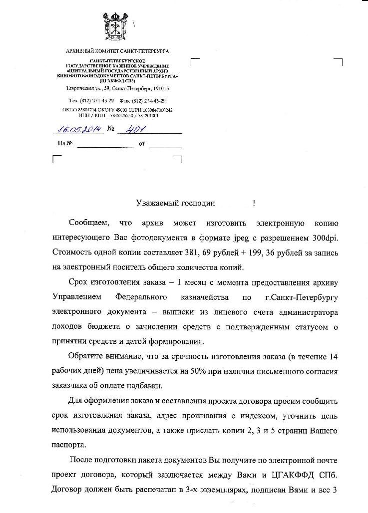 Решил я заказать одну (!) фотографию в архиве фотодокументов. В электронном (!) виде.