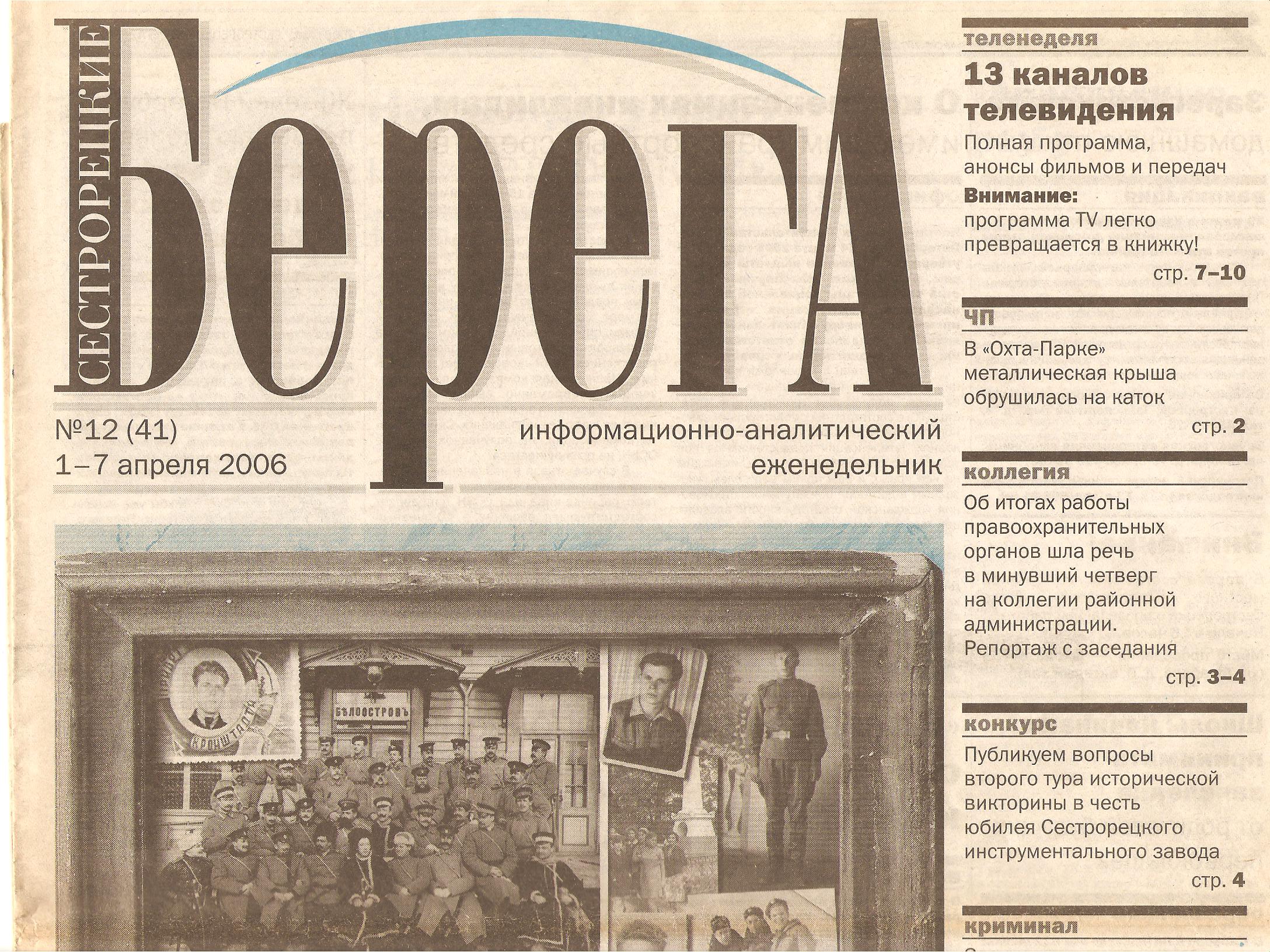 Как-никак, сама статья в газете была опубликована. Каким-то чудом, у меня в подписи к статье стоит следующая подпись:краевед эксперт писал(а):Третье фото было опубликовано в газете "Сестрорецкие берега" №... (нужно искать в своих архивах) на первой полосе. Статьи в газете не было.
