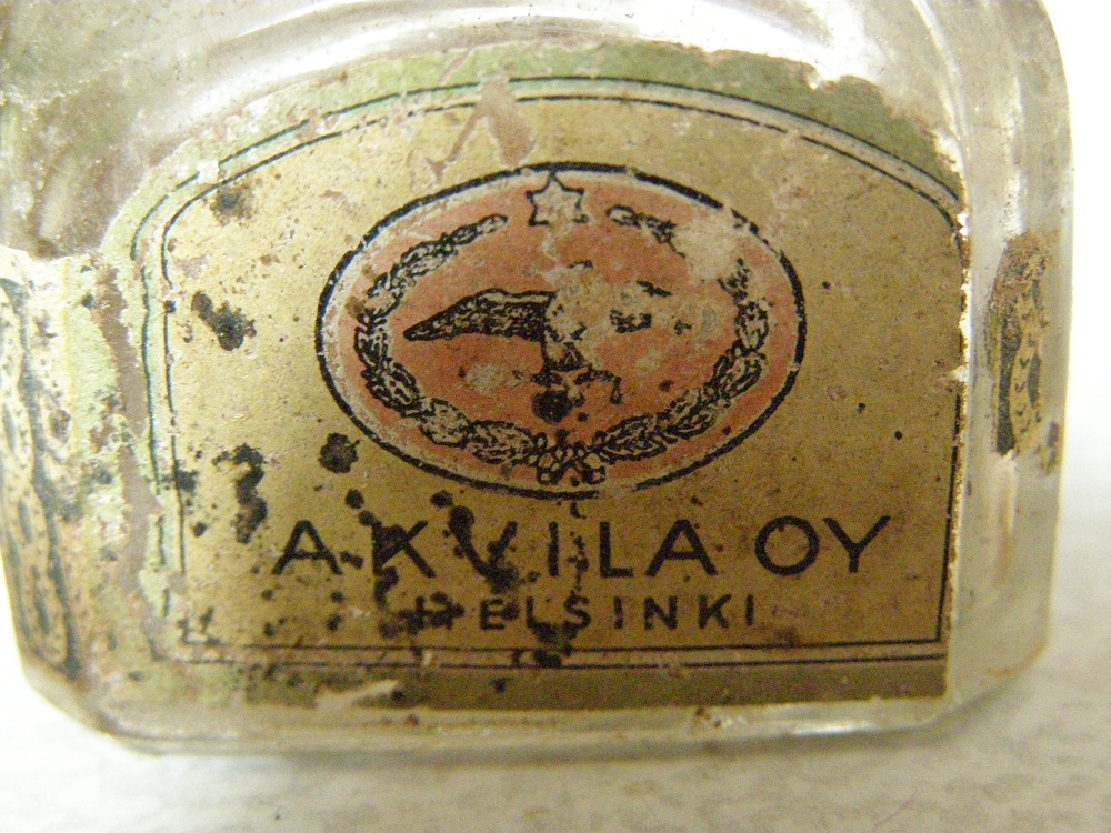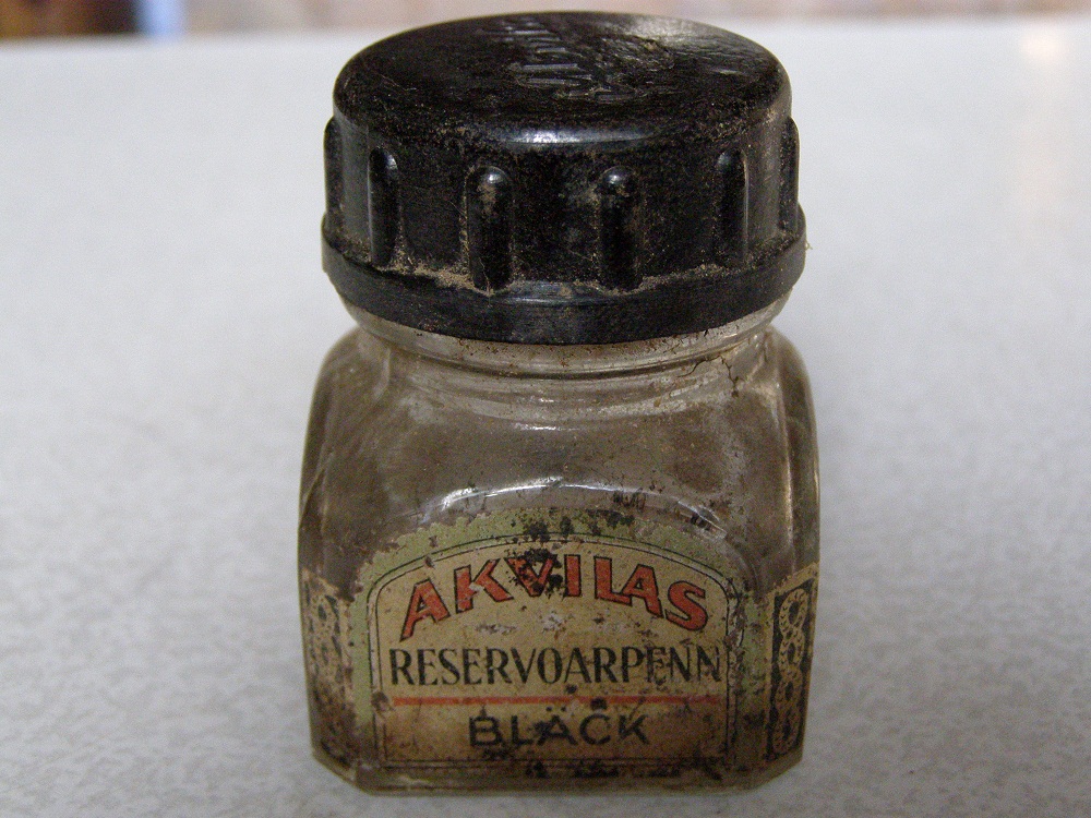 Вот попался пузырек из под чернил с хорошо сохранившейся бумашной этикеткой.