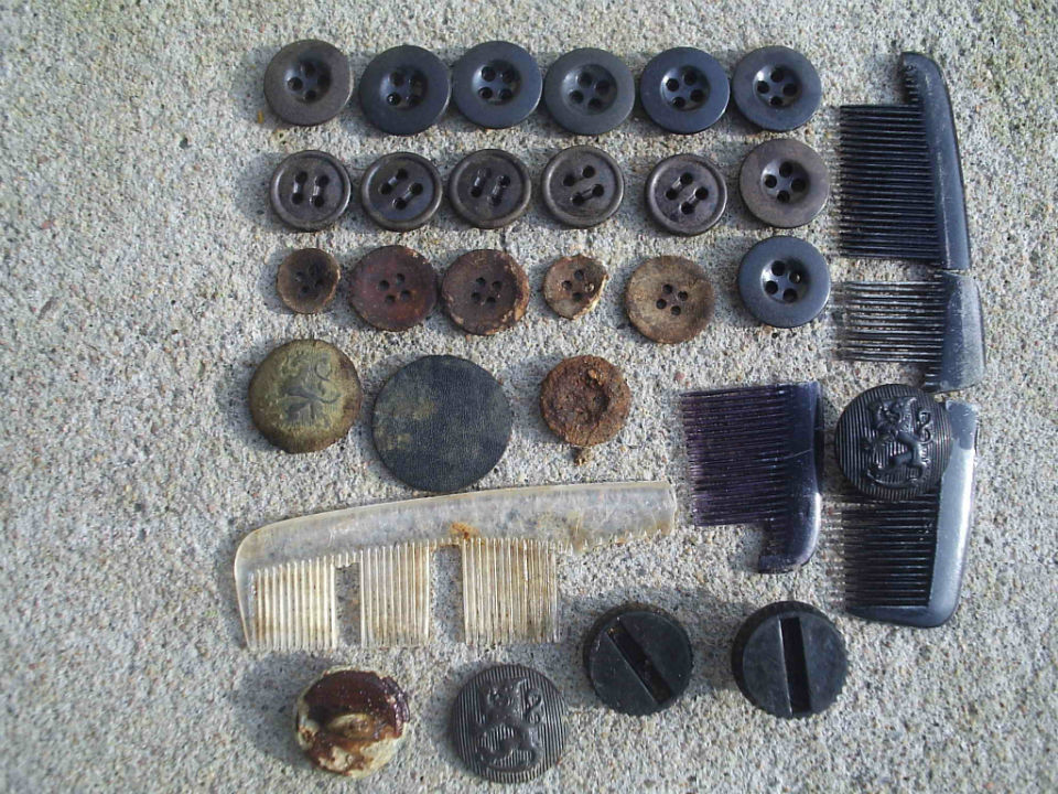 Пластиковых пуговиц несколько видов есть (не считая размер за вид) - из черной и серой пластмассы, с пластиковым и железным ушком. С железным ушком часто несохран - проволока пухнет внутри пластмассы и раскалывает ее.