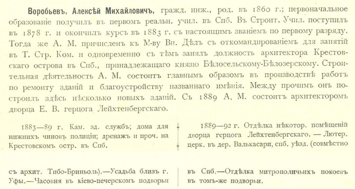 Об архитекторе-соавторе кирхи А. М. Воробьёве. Из юбилейного сборника сведений о деятельности бывших воспитанников Института гражданских инженеров (Строительного училища). 1842—1892.