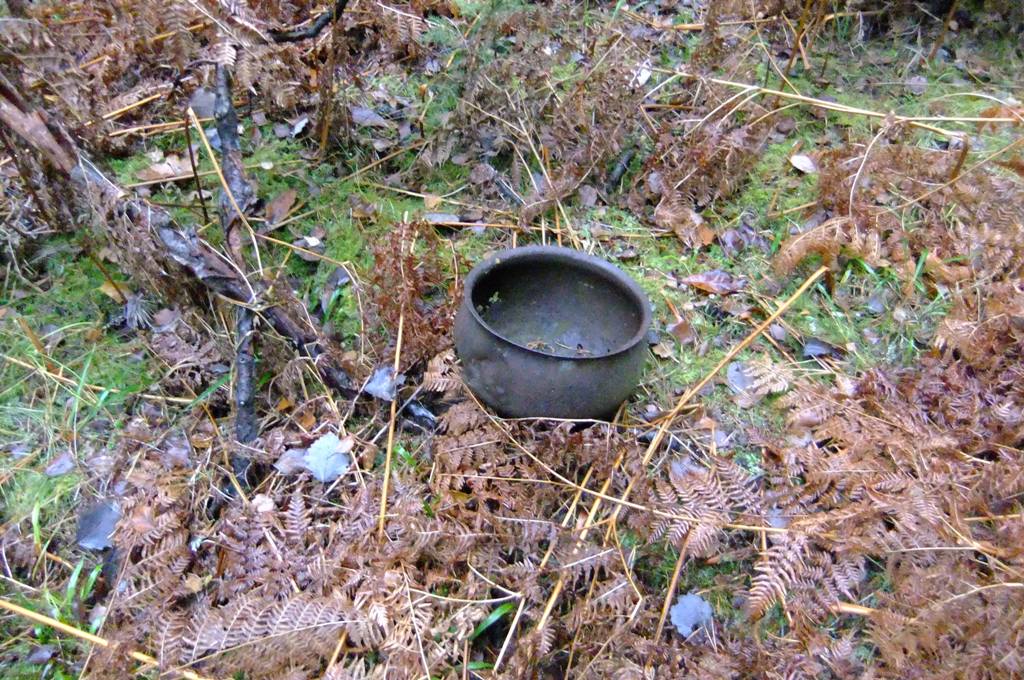 Вчерашние же итоги таковы. Никаких, даже контурных, следов фундамента не увидели. "Глубокой ямы с водой" не нашли, не говоря уже о яблоне. В то же время (после очередного "тура" копателей, свежие следы которого видны по всей поляне) встретились новые, вполне аутентичные предметы домашней утвари, ещё раз говорящие о том, что дом здесь таки был. На одной, достаточно большой и ровной площадке под группой тесно растущих, явно послевоенных ёлок в давно уже вырытой яме виден камень, который мог бы быть и фундаментным... Вообще, вся растительность и на поляне, и вокруг неё -как в сторону дороги, так и на юг, в сторону карьера - относительно молодая. Редкое исключение составляет большая сосна посреди поляны, на вид лет 80, не меньше. Вполне могла сохраниться и со времён Толппа.
