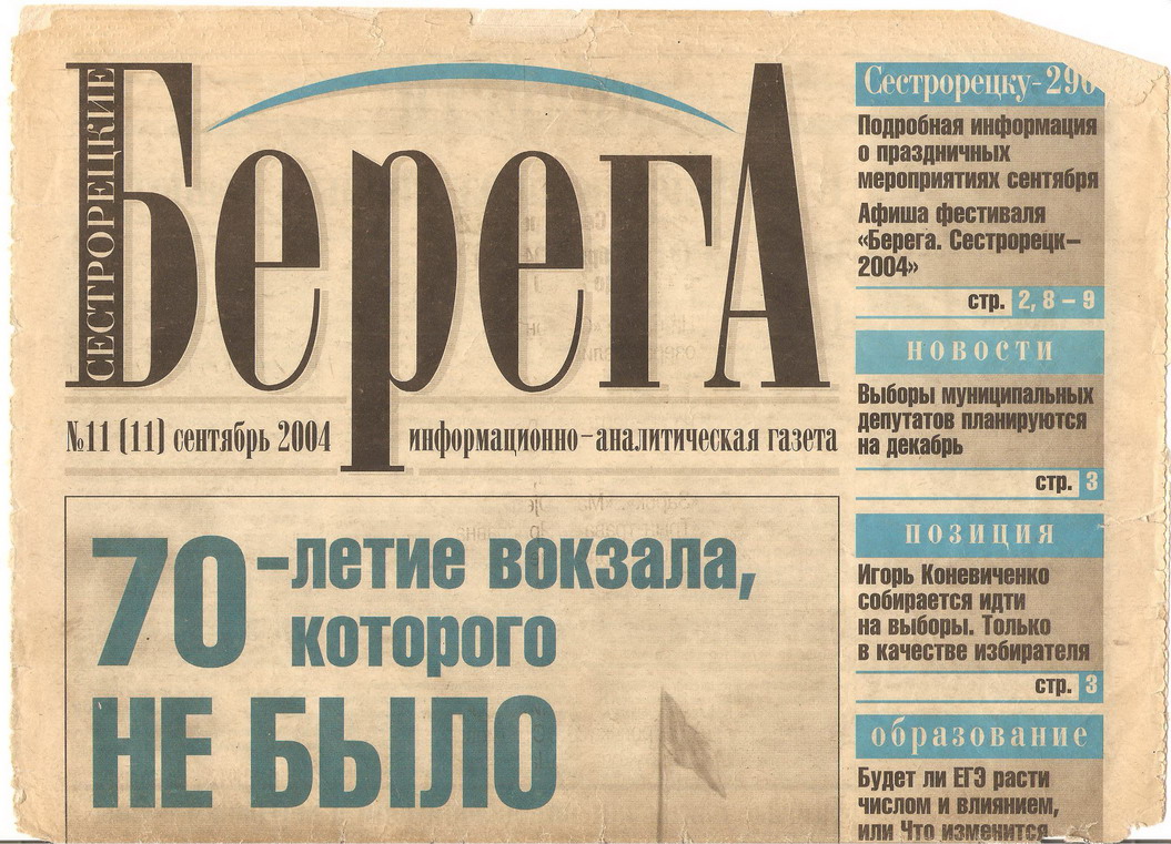 На первой полосе газеты от сентября 2004 г. помещен анонс с фото арки при въезде в пограничный лагерь Белоострова с надписью «70 лет вокзалу, которого не было».