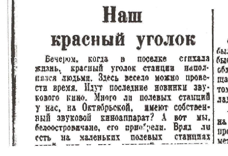 Когда собирал материал для статьи "Путешествие на зимнюю войну" http://beloostrov.ru/stat_06.html ,то в газете за 1939г. нашел статью о станции Белоостров и заказал копию части страницы. Сегодня обратил внимание, что на копию, к сожалению, попала только часть заметки о красном уголке станции.