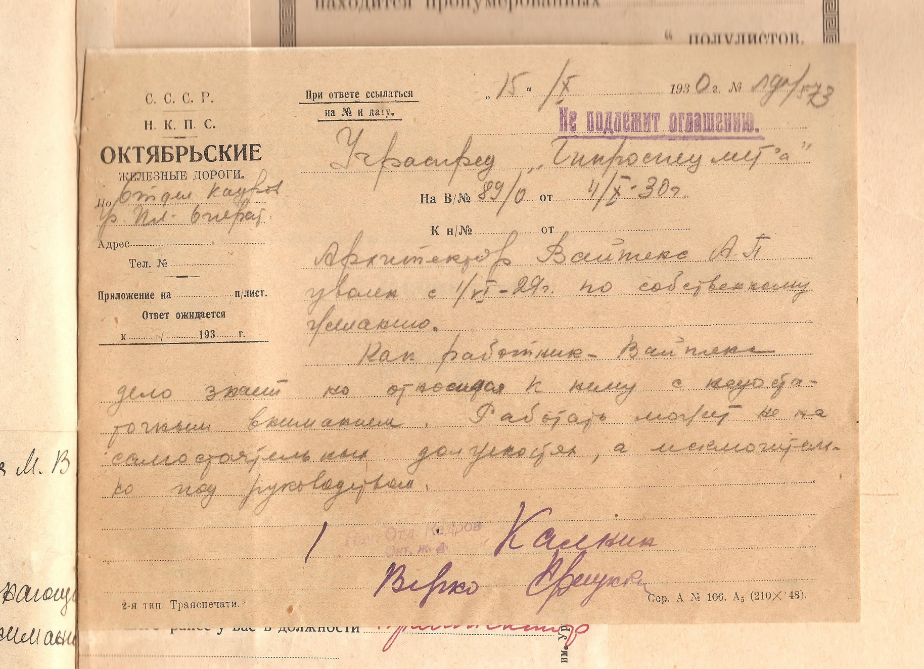 Архитектор Вайтенс А.П. уволился по собственному желанию из стойконторы ОЖД в 1929 г. и подал заявление о приеме на работу в качестве архитектора в "закрытую контору" ГИПРОСПЕЦМЕТ.