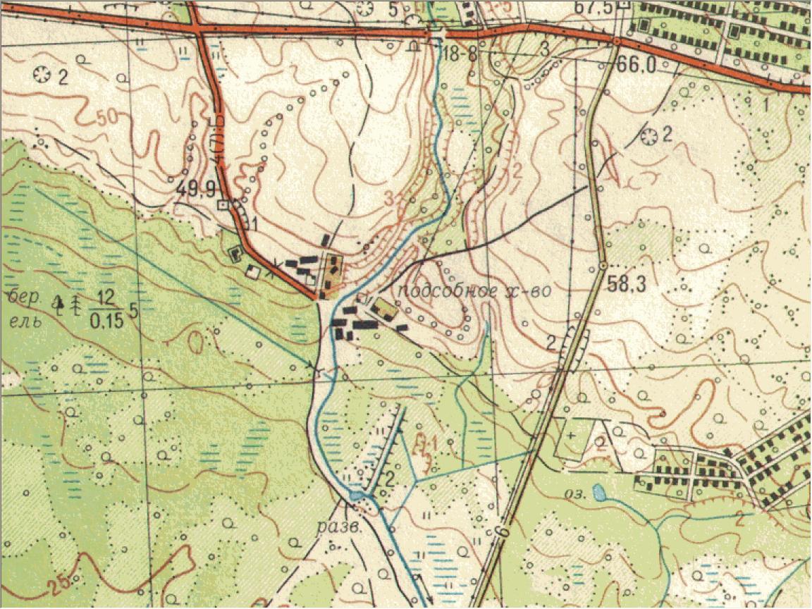 на карте Подсобное показано что подсобное х-во находится на левом берегу ручьяСтарый дачник писал(а):Я имею в виду ту плотину, которая на карте первая по счету ниже шоссе. Хорошо помню высокие берега ручья и остатки каменной кладки плотины с двух берегов. Вдоль левого берега от шоссе раньше шла дорога, по которой ездили на велосипедах. Дальше, ниже по течению, был мост, через который можно было переехать на правый берег. Там находилось некое подсобное хозяйство, куда ходили за молоком (где-то в районе нынешних Полян-2). Было это в конце 50-х.