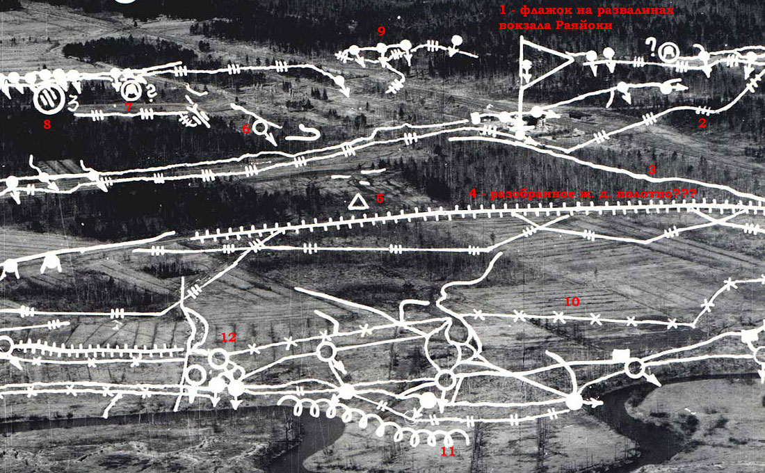 С мостом и фундаментом кирхи все понятно, это однозначно они. Ничего похожего на кладбище не увидел. Что это за странная фигура на переднем плане перед самой финской передовой - не понятно.