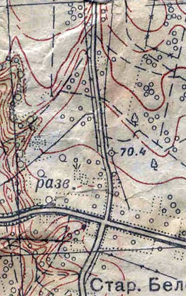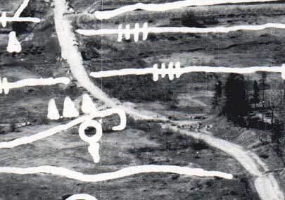 Несколько мыслей по поводу. Судя по размерам и расстоянию между телеграфными столбами, общая длинна и ширина этой загадочной фигуры - порядка 60-80 м, а ширина "полос" - раз в 6 меньше, т. е. порядка 10-15 м. По краям, то ли окопано канавами, то ли обнесено кустарником. Линии очень неровные - это точно не каменная кладка, т. е. на фундамент не похоже, кроме того что-то он великоват для деревянного здания, а от каменного остались бы кучи камней. Да и теней нет. А судя по теням от телеграфных столбов (солнце на юго-западе), время съемки - порядка 14-17 часов. Да, еще о времени, за фундаментом кирхи хорошо видны большие деревья. Хвойные стоят густо покрытые хвоей, непострелянные, непокалеченные, а рядом лиственные без листвы, т. е. это поздняя осень или весна, но никак не лето, и тем более, не зима, как вы понимаете.