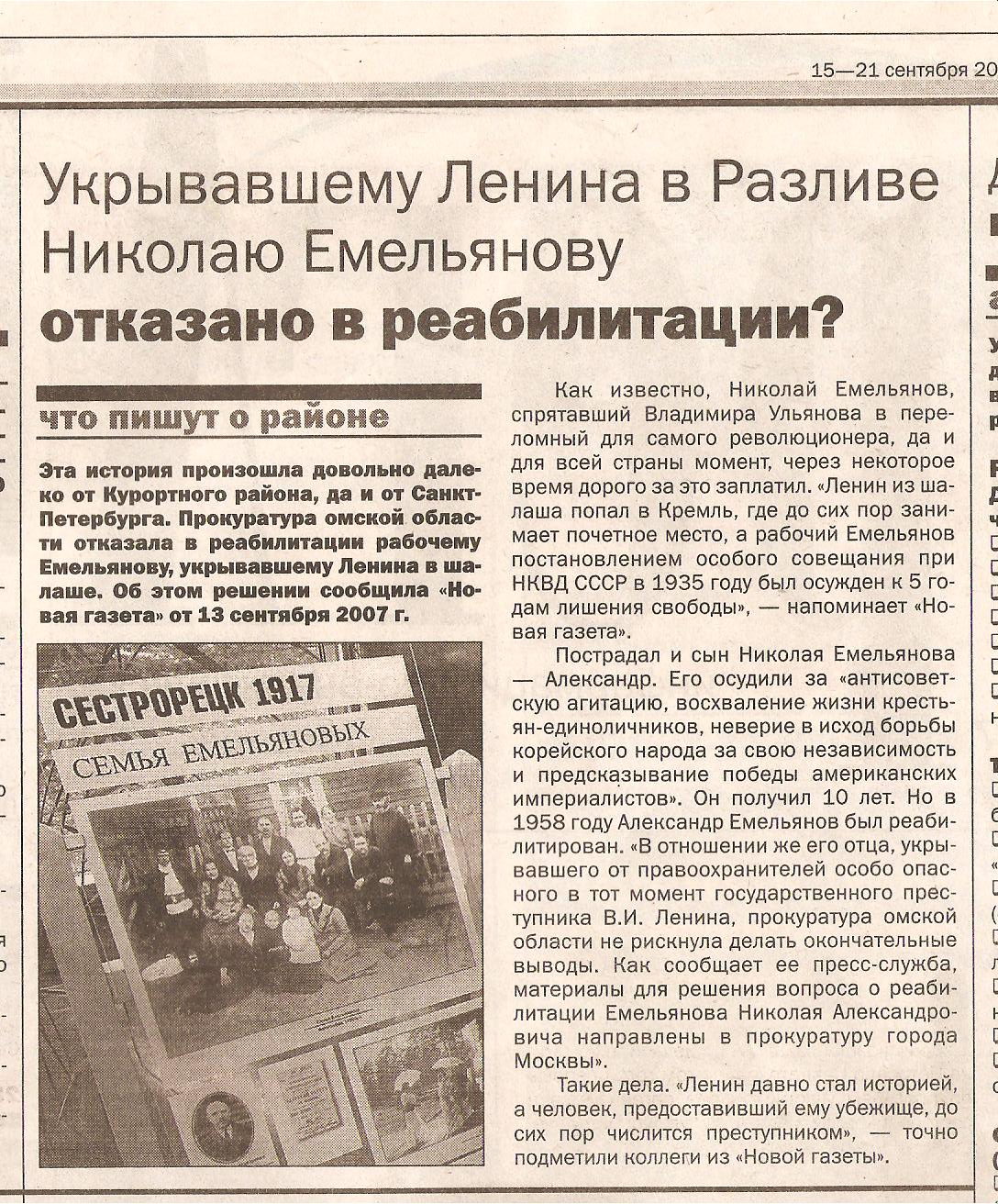 Ниже приводится статья из газеты "Сестрорецкие берега" №35 (115) 15-21 сентября 2007 г.