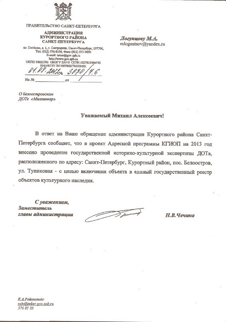 краевед эксперт писал(а):Для продолжения переписки с КГИОП Петербурга в 2007г. о признании ДОТа памятником .... в отделе культуры меня попросили повторно вновь обратиться с письмом на имя Главы Курортного р-на Борисову В.К.