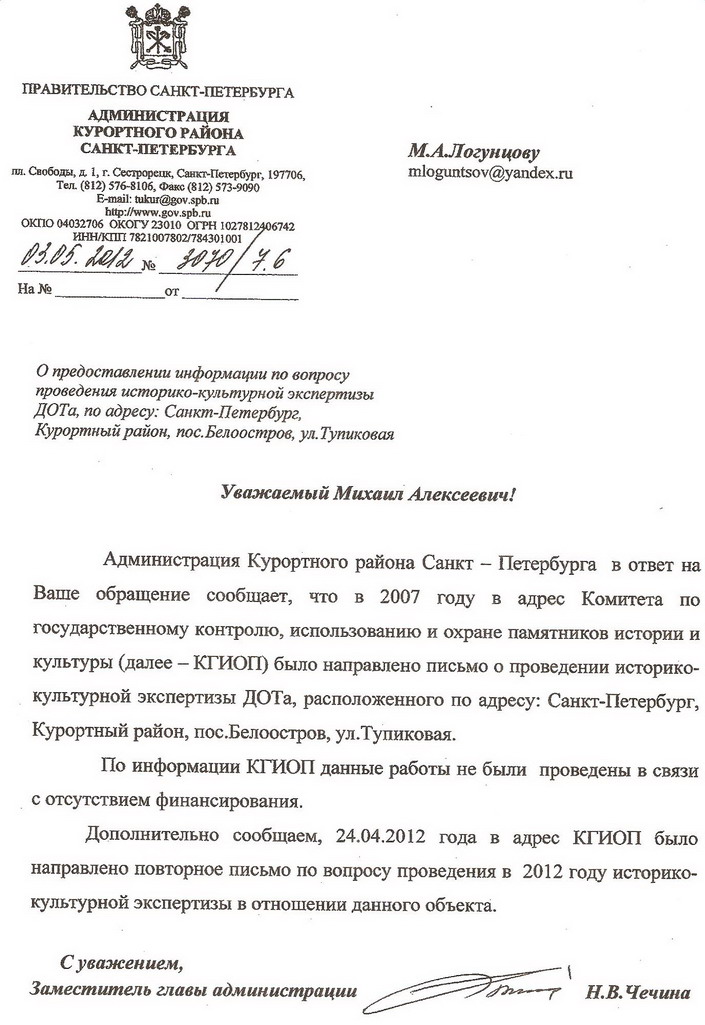 Также прикрепил ответ от администрации для Логунцова от 03.05.2012г., объясняющий причину неисполнения КГИОПом проведения экспертизы в 2007г. Но об этом мне сообщили только после того, когда я обратился с официальным письменным обращением к главе Курортного р-на Борисову в 2012г. А до этого мне в устной форме из отдела культуры Курортного р-на, в течение 5 лет объясняли, что у них все под контролем.