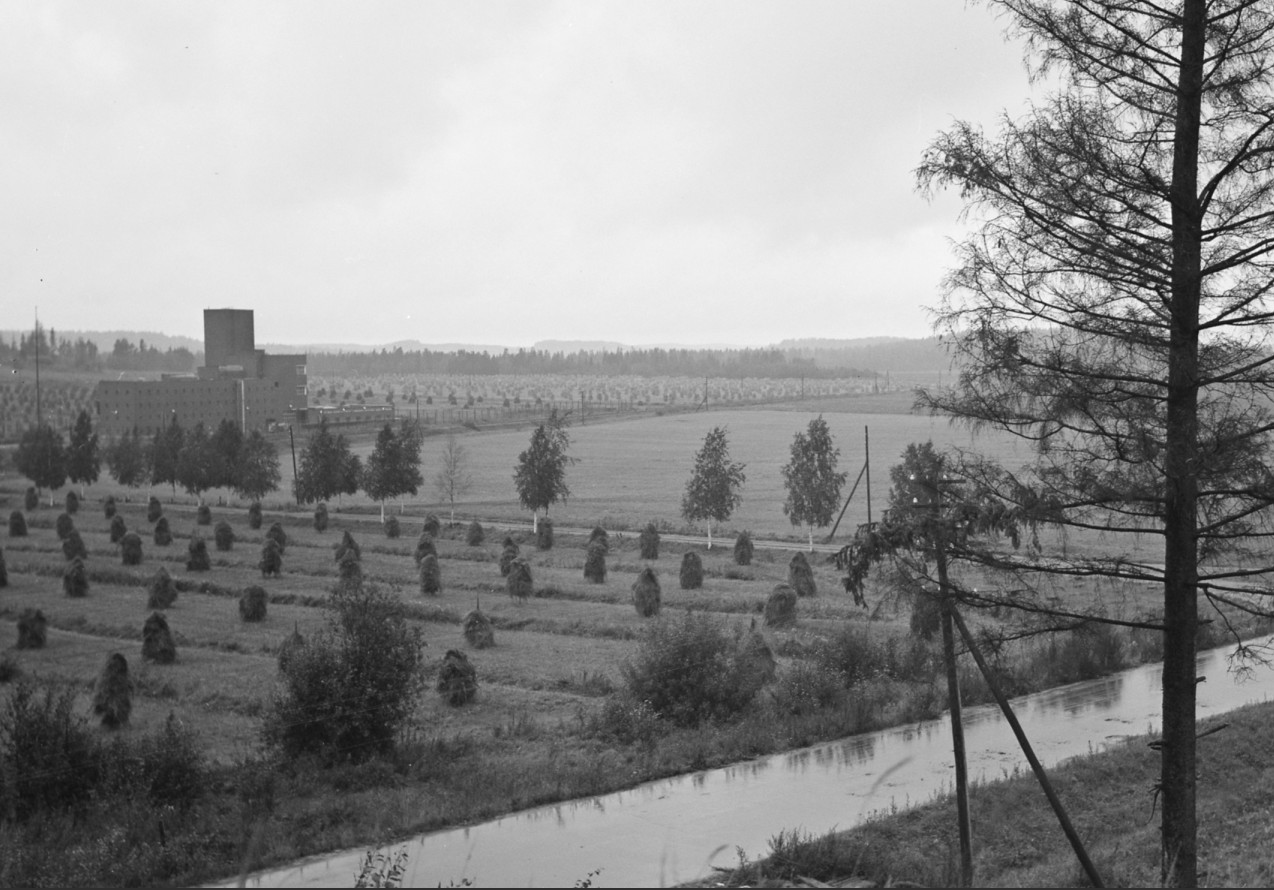 Вид на молочный заводик в Энсо. Справа от него горка с домом. Под домом дот с заложенными кирпичем амбразурами
