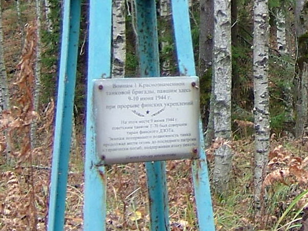 Памятник строго восточнее Пасторского, почти на долготе Лампиярви. Табличка гласит о том, что экипаж танка в составе 1 Краснознамённой танковой бригады совершил таран финского ДЗОТа при прорыве финских укреплений ценой потери подвижности танка. Стрелял до последнего патрона, поддерживая атаку пехоты и погиб. 9-10 июня 1944. Так что здесь и была линия фронта.