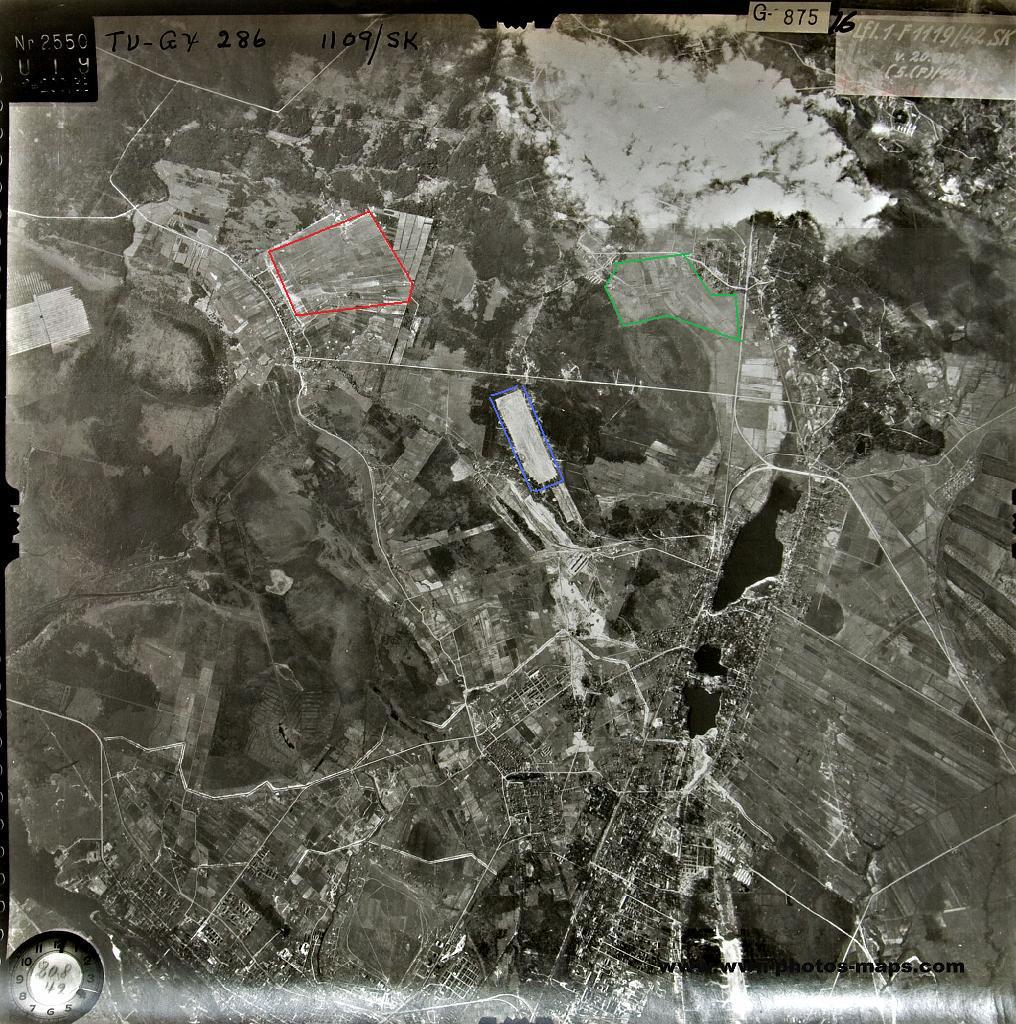 943 шап 277 шад 13 ВА (полное правильное наименование: 943-й штурмовой Нарвский Краснознаменный ордена Кутузова авиационный полк) в июне 1944 г. базировался на аэродром "Парголово", о чём свидетельствуют приведённые выше фото, а также др. документы, связанные с полком. Этот аэродром назывался в разных источниках (наших и вражеских) также "Шувалово", "Светлана", "Озерки" (об этом см. напр. здесь) На приведённом ниже АФС он обведён синим контуром. Красным контуром показан аэродром ВВС КБФ "Каменка". Зелёным контуром обведено поле м-ду Парголово (точнее его частью - д. Михайловкой) и совхозом Пригородный, которое, по предположению финнов, тоже м.б. аэродромом . Нельзя исключать, что 943 полк мог использовать и эту площадку, действительно расположенную фактически в Парголово.