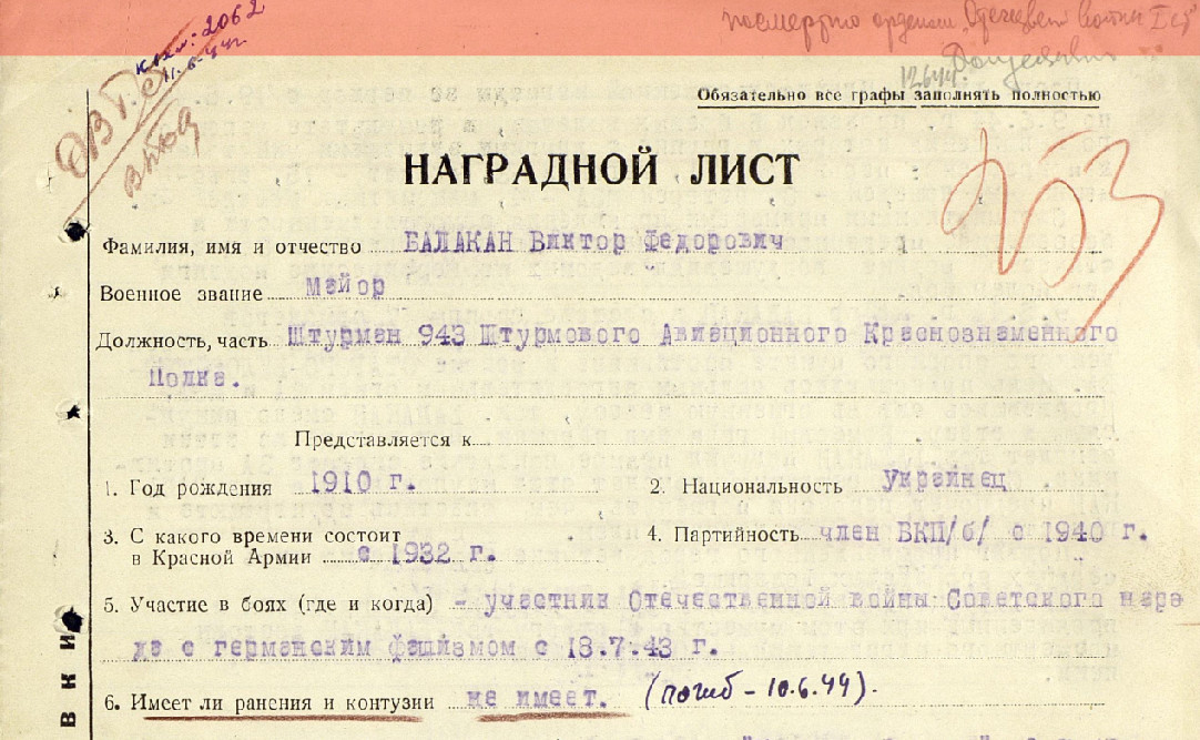 Информация о награждении Балакана медалью "За боевые заслуги" полученная в письме от 20.01.77г. от Марии Федоровны Балакан, очевидно ошибочна, т.к. нет сведений с указанием № и даты. Хотя на два ордена и медаль "За оборону Ленинграда" вся информация изложена подробно.