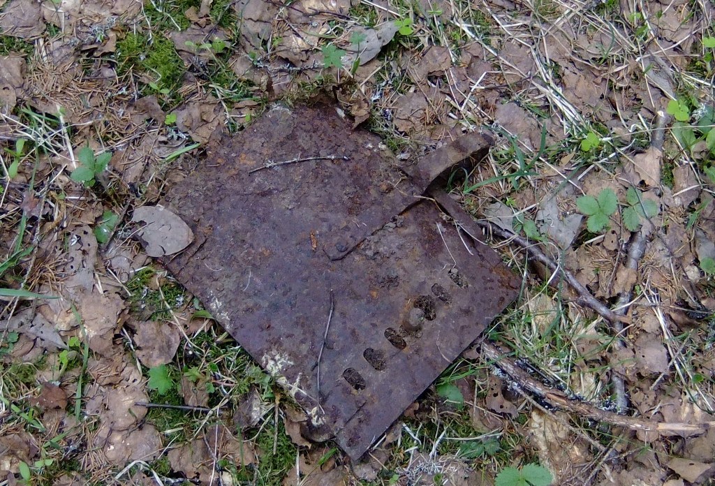 Башню, как уже было сказано, обнаружить не удалось. Что не удивительно, столько лет прошло... Зато следы деятельности поисковиков налицо: и вершина, и всё подножье высоты - в ямках. Не представившие, очевидно, ценности артефакты разбросаны тут же. Кое-что из них, свидетельствующее о прошлом этой высоты, предлагаю вашему вниманию.