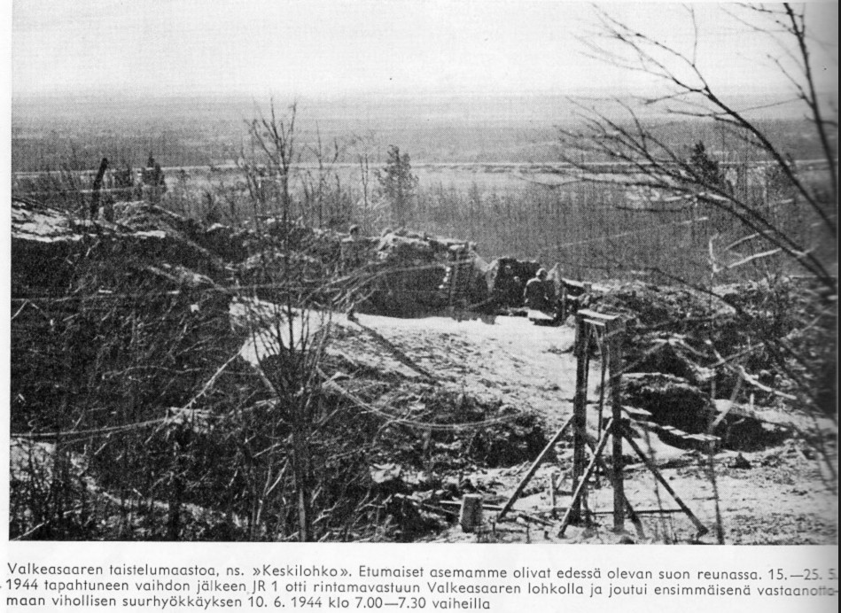 "Поле боя у Белоострова, т.н. сектор К. Передовая позиция проходила по краю болота. 15-25 мая произошли изменения и 1 пехотный полк взял на себя ответственность за участок у Белоострова и первым принял на себя вражескую большую атаку 10 июня 1944 год