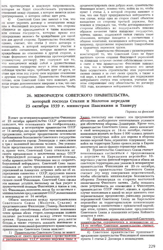 В меморандуме советского правительства от 14.10.1939, как видим, Ханко присутствует на 1 месте. И островки имеются (пункт 3). Финны ответили меморандумом от 23.10.1939. Текста его в интернете не нашёл, также не нашёл и текста ответного меморандума советского правительства от того же числа. Поэтому привожу сканы из сборника "Принимай нас, Суоми-красавица" ("Карелико", СПб, 2010).Здрагер писал(а):От предложения сдать Ханко в аренду Сталин довольно быстро отступил. Он же искал приемлемые варианты. Островки в качестве варианта появились ВМЕСТО Ханко.
