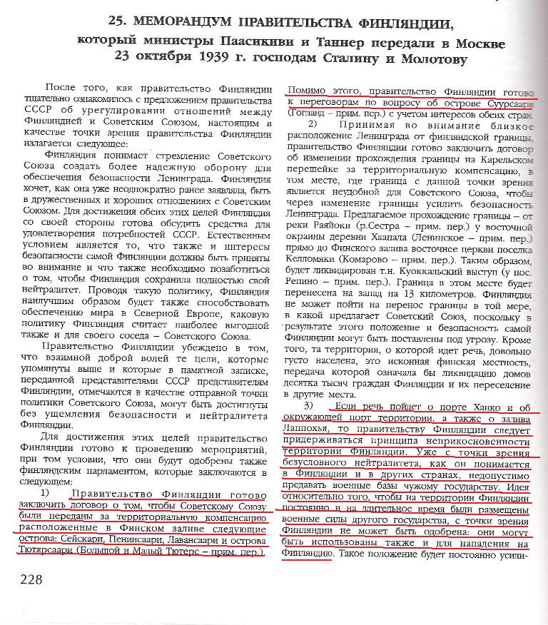Как уже говорил раньше, не думаю что это было предложением компромисса, последней "уступкой" - при той позиции, на которой твёрдо стояла финская сторона. Скорее - поводом, чтобы сказать, что "ничего не выйдет". Интересно, что Таннер вспомнил о Руссарё только в мемуарах, написанных через 17 лет. В документах (см. ниже) этот остров не упоминается, или м.б. имеется ввиду в числе "островов, лежащих вблизи финляндского материка". Хотя сама по себе деталь интересная.raevsku писал(а):А 9 ноября Сталин предложил новый компромисс - уступить только лишь о.Руссарё!