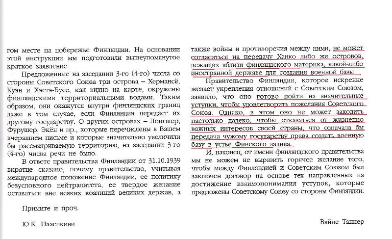 "Сталин заявил, что только советское правительство признало независимость Финляндии. Об этом не помышляли ни царское правительство, ни даже Временное правительство. Но советское правительство требует гарантий безопасности своей собственной страны. В этом плане Финский залив представляет весьма большое значение. Поэтому советская сторона настаивает на передаче Ханко и Лаппохья. Если это имеет значение для Финляндии, то она может оговорить любую юридическую форму для уступки Ханко: аренду, продажу или обмен.