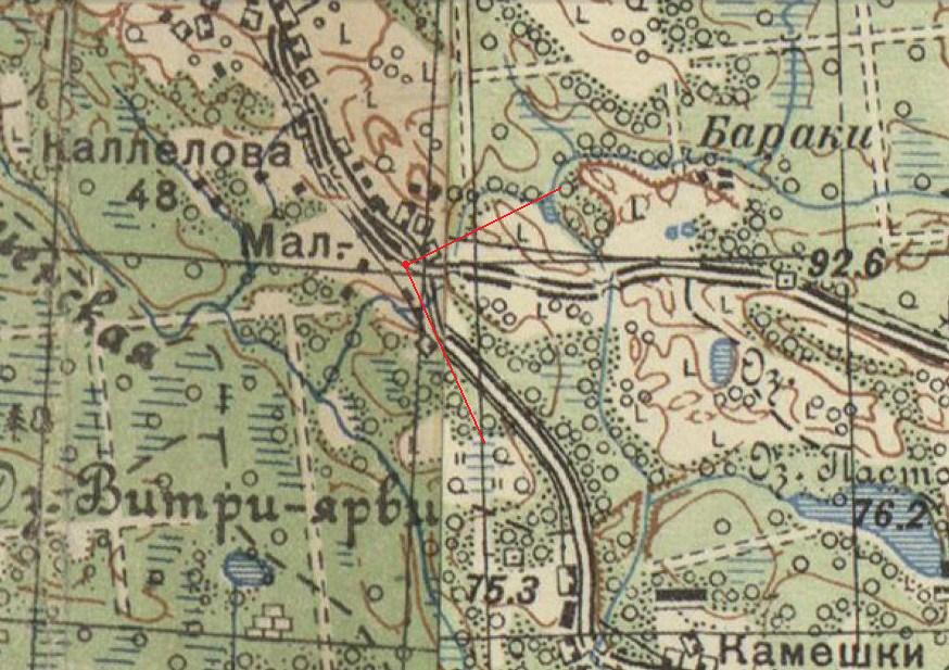 Тогда получается, что повозка едет в Каллелово по новой, советской, дороге , ставшей как бы продолжением 1-й танковой (финны называли её Vaskisavotan, Меднозаводской), а сзади, сразу после моста налево пошла старая, "верхняя" каллеловская дорога?