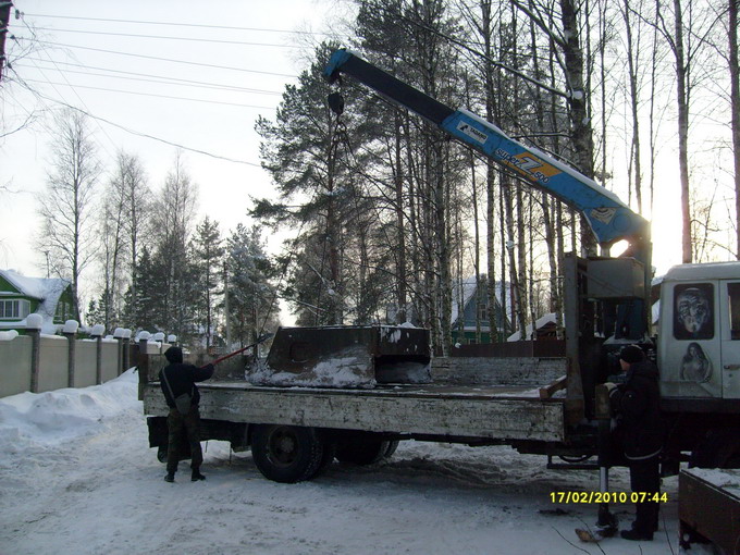 Олег Бушко, председатель совета молодежного патриотического клуба «Сестрорецкий рубеж»: «Из земли выкапывали мы ее осенью, где-то до первых морозов, октябрь, ноябрь. Поставили на бревна, чтобы она под собственной тяжестью в землю не ушла и не вмерзла».