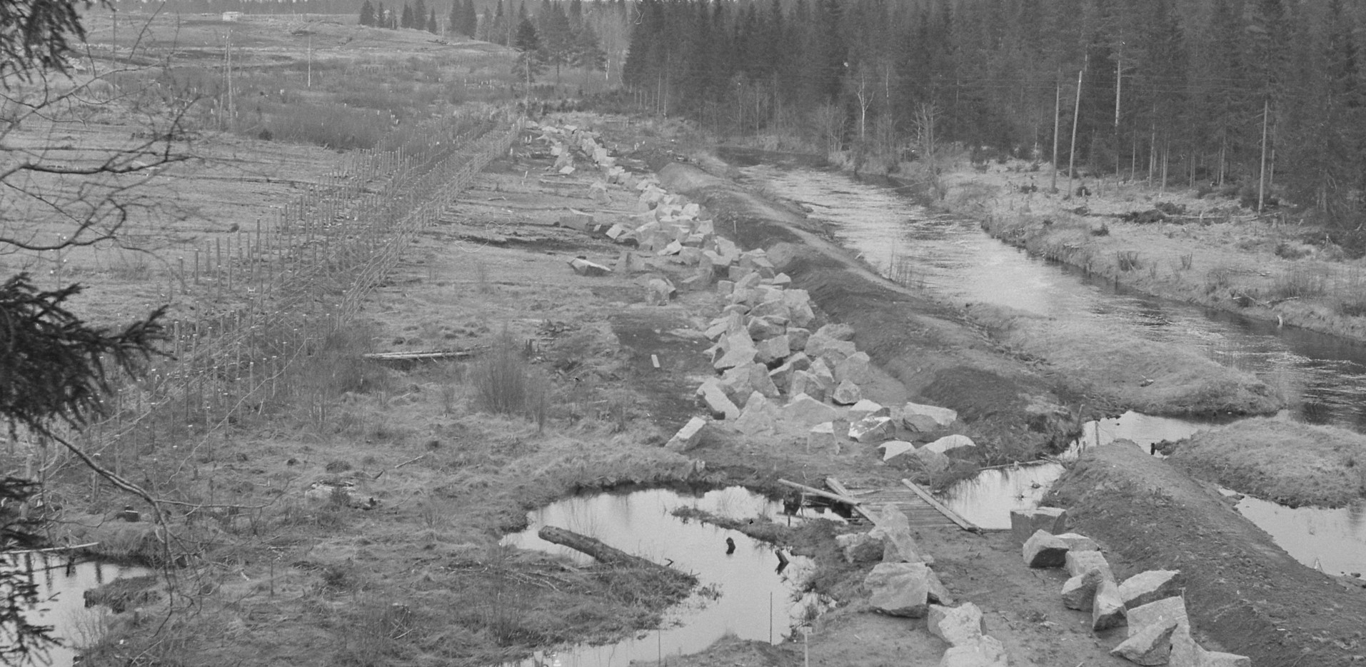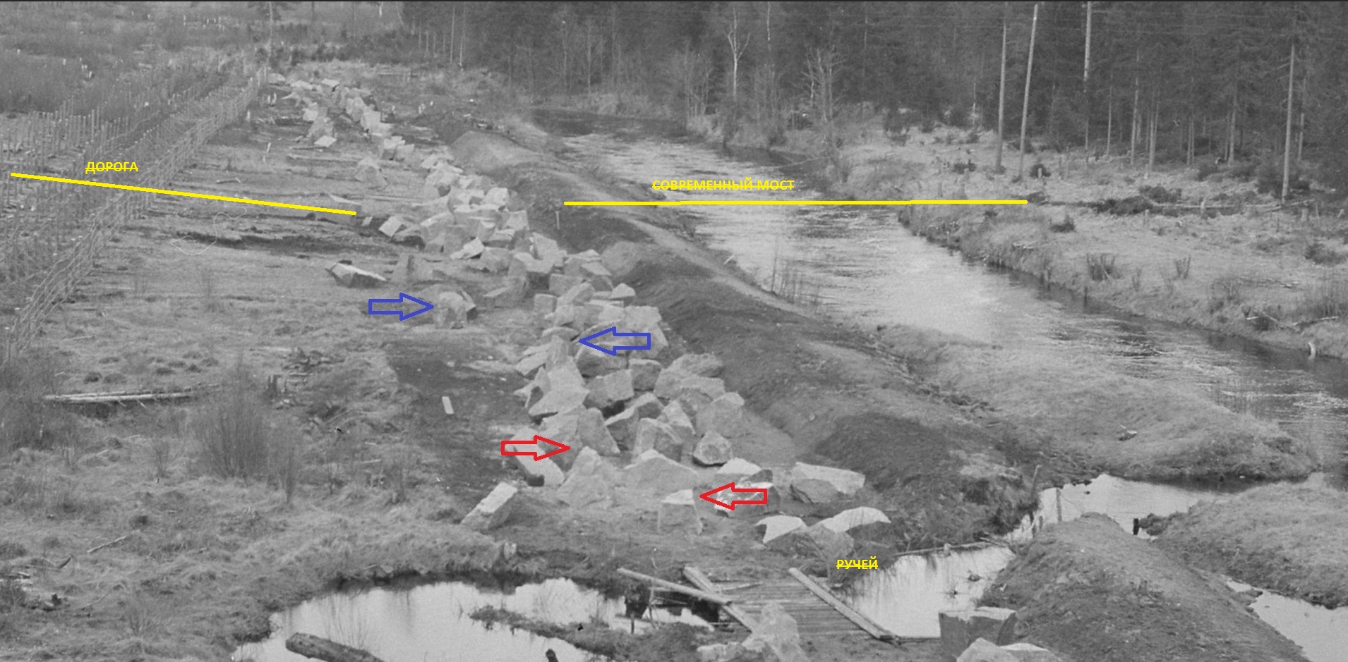 На финском фото видны нагромождения камней перед ручьем. Сейчас такого нет. Почти ровные два ряда. Финны могли их из этой кучи потом далее по берегу растащить