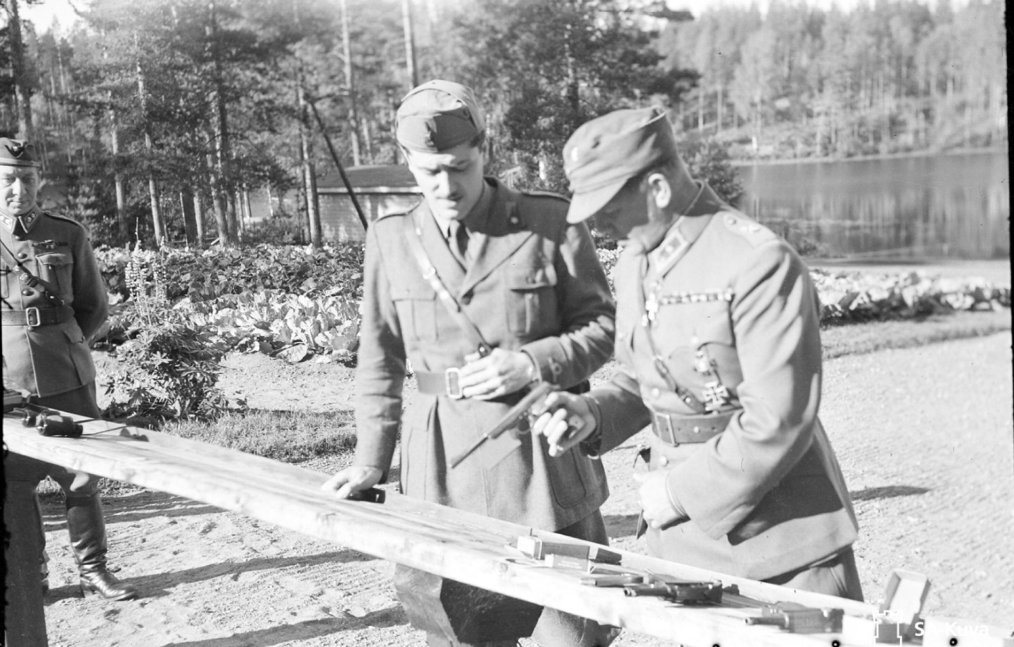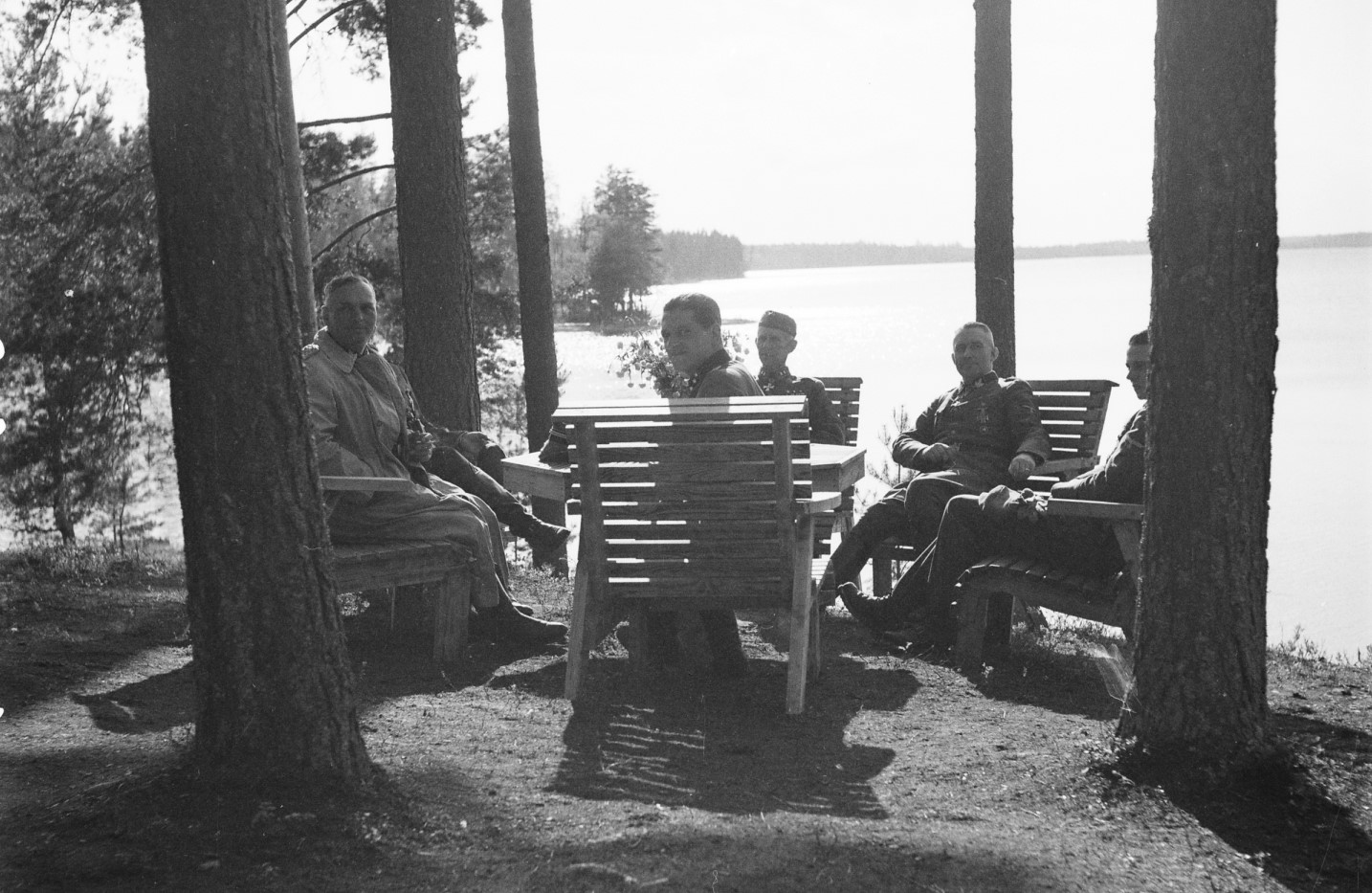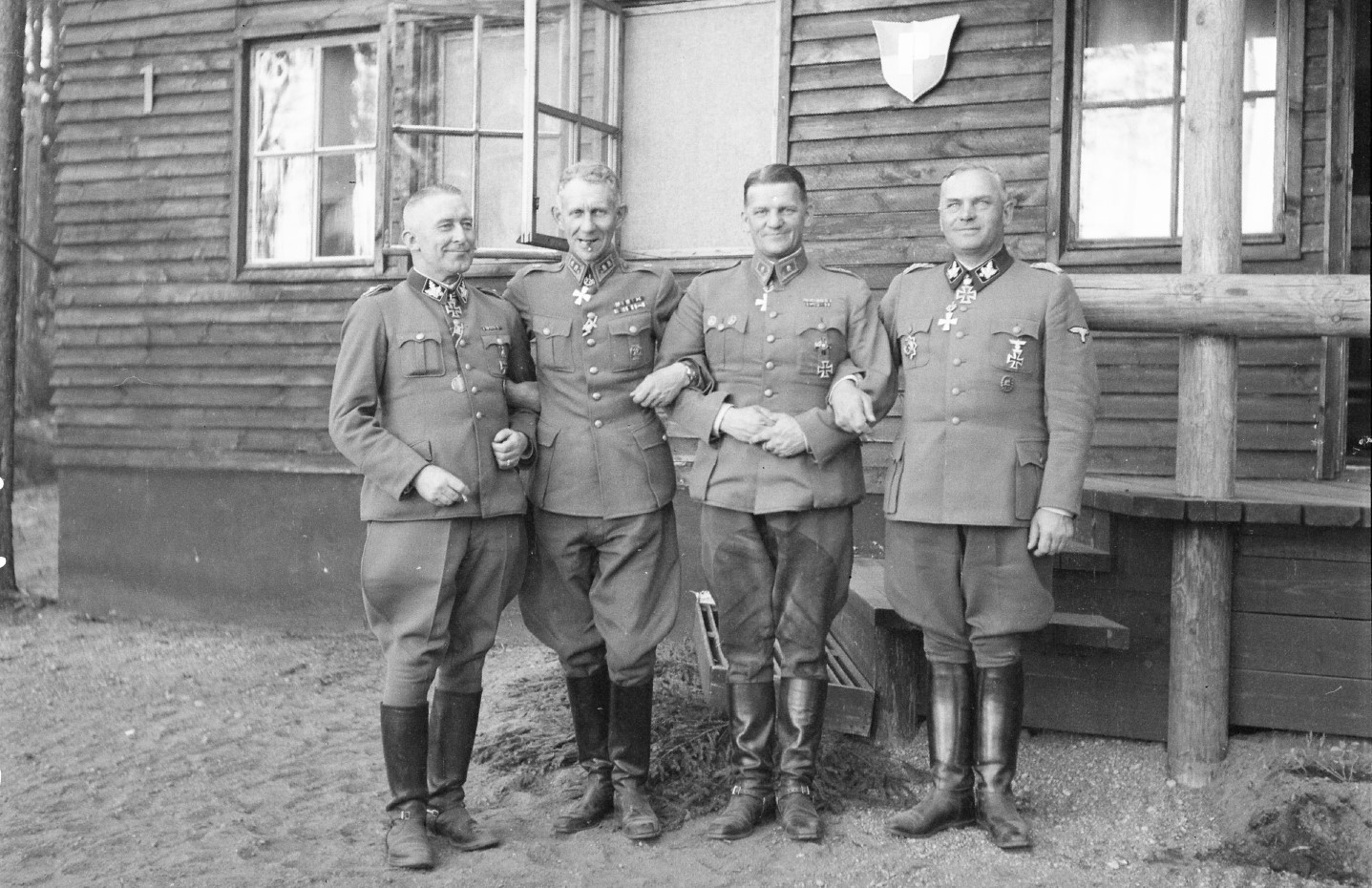 14 октября 1942 года Паяри посетил сам дедушка М со своей свитой. Потом поток не иссякал. Пёрли, кому не лень. Некий итальянский военный фотокор лейтенант Пеллегрини приехал специально пострелять из пекаля. Настрелялся, видно, вусмерть. Потом Пеллегрини еще в архиве присутствует. Геройски позирует на фоне пушки, нацеленной в Финский залив. К Паяри приезжали и братва по оружию. 4 июня 1943 года на побывку прибыли два генерала сс. Один - уже небезызвестный (где-то мелькал в обзоре) Феликс Штайнер. На тот момент он командовал 3 танковым корпусом сс. Про корпус информация разная. Но, вероятно, тогда он формировался-переформировывался и Штайнеру было нечем особо заняться. Второй дядя с очень интересной фамилией – без ста граммов и не произнести. Маттиас Кляйнхайстеркамп. Во как! Тоже, между прочим, группенфюрер сс. Другие к Паяри и не ездят. Он командовал тогда 6 горной дивизией сс «Норд» ( информация на этот счет тоже разная). Дивизия воевала где-то в северной Норвегии. А командир совершал турне в это время по Карельскому перешейку. Ну и Эквист постоянно в этой компании. Заезжал и генерал Эрфурт, награждал отличившихся Железными крестами. Потом обмывали это дело за красивым столом на природе. Приезжали разные гражданские делегации. На фото, похоже, делегация шведского парламента. Они очень любили бывать на перешейке. И, конечно, самый-самый дедушка ( даже дедушковее самого М) Свинхувуд приезжал к Паяри пострелять.