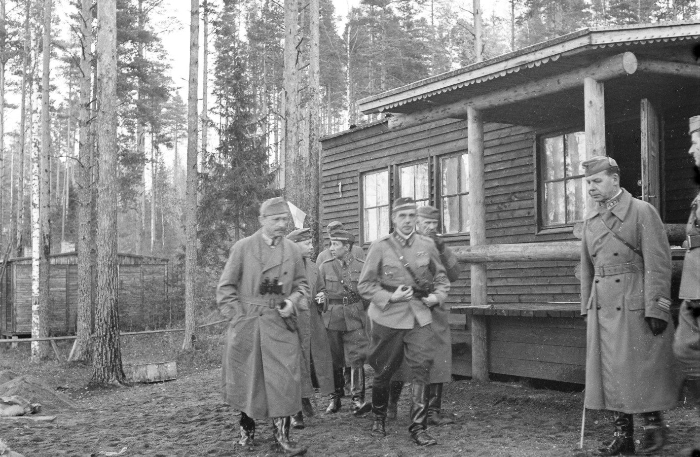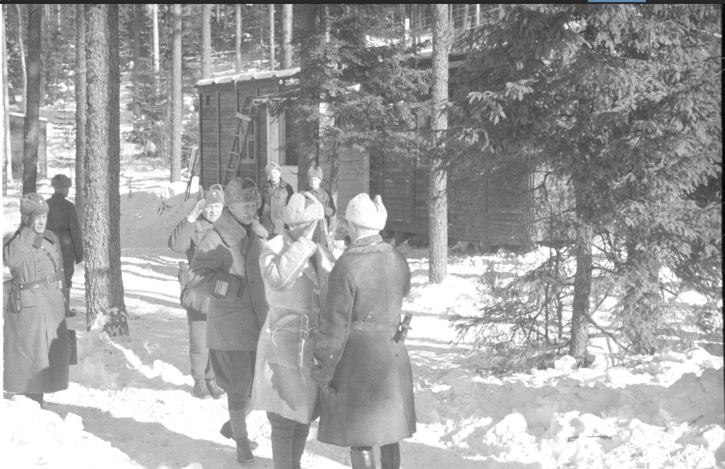 Приветствую уважаемых коллег! Хочу предложить небольшой обзорчик. Посвящен он будет расположению штаба 18 пехотной дивизии финнов. Генерал-майор Паяри выбрал место для своего штаба на берегу озера Каукъярви, нынче известное как Большое Симагинское, или просто Красавица. Первые фото, что я обнаружил в архиве, относятся к 7 марта 1942 года. К Паяри прибывает делегация финских генералов во главе с генерал-лейтенантом Х. Эквистом. В то время он был командиром IV Армейского корпуса ( или уже опергруппы «Карельскиий перешеек» ?- везде по-разному пишут. Но не суть важно). С Эквистом прибыл чел, похожий на представителя Генштаба генерал-майора Айро ( а м.б. я путаю). Штабной домик совсем новый. Бревнышки и досочки белые и свежеструганные.