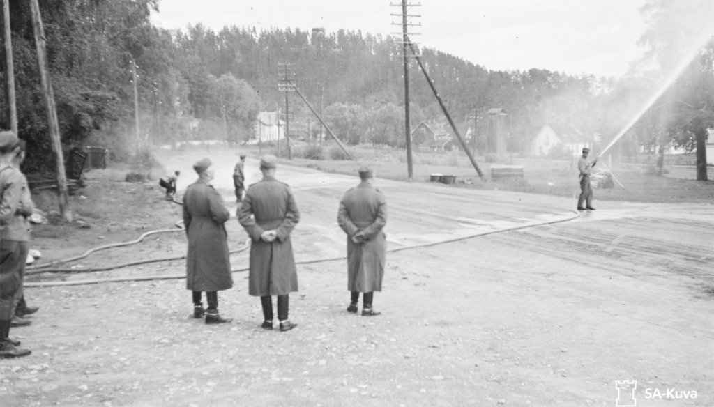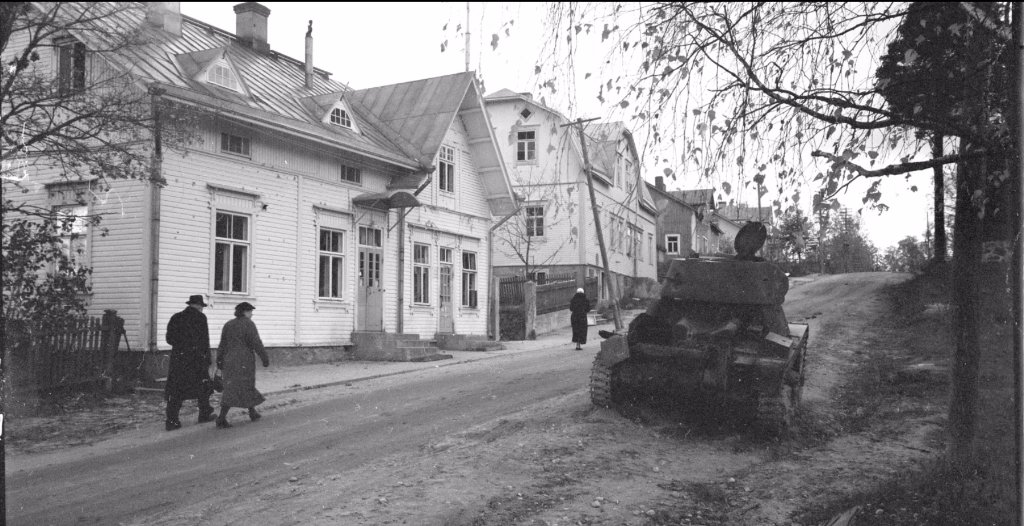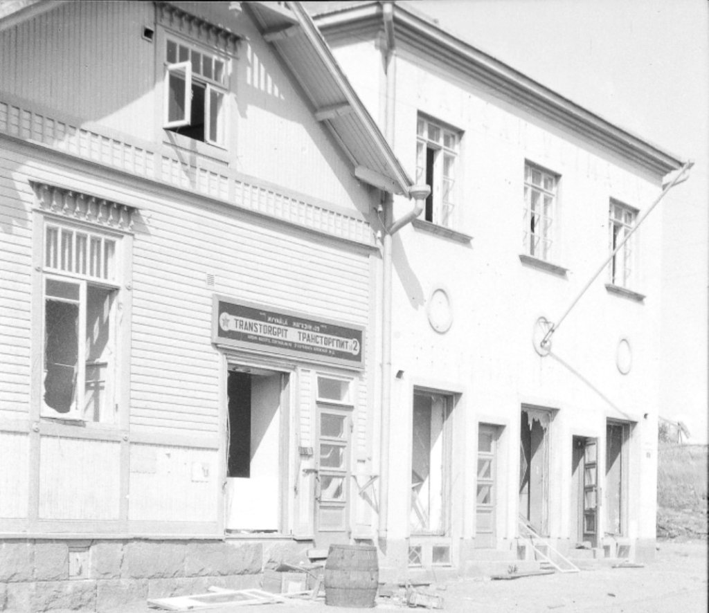 , только вид с другого бока. Подпись гласит - "Народный дом, где находилась международная торговля. Сгорел 14.8." И дата съемки обозначена 14.8.1941. Т.е. корреспондент стоял и ждал, когда упадет бомба, чтобы написать, что дом вот прямо сегодня и сгорел