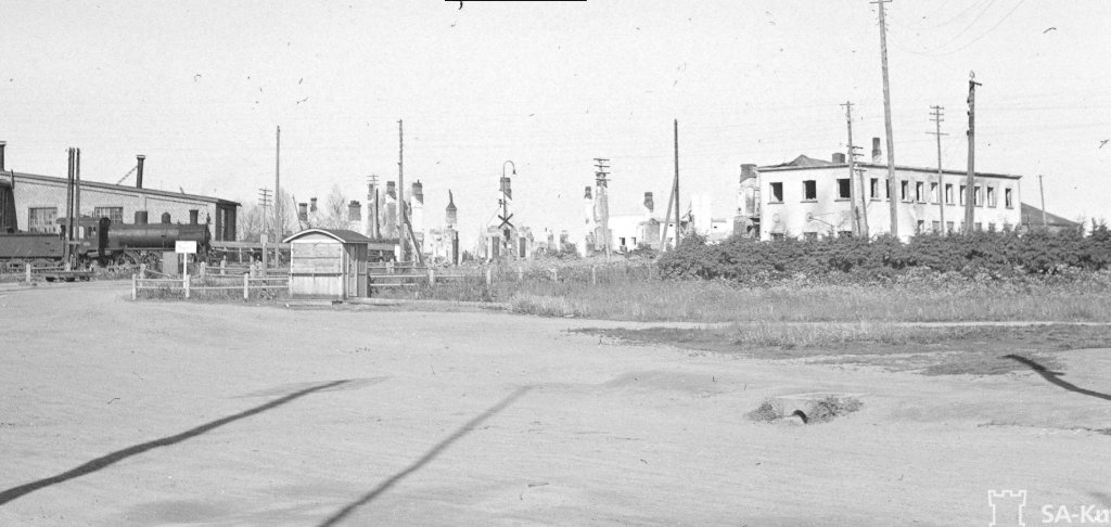 И кода я еще фиг знает в какой раз пролез по архиву Сортавала, я нашел наконец то, что нужно. Фото 94376. Здесь и паровоз, и переезд, и дом с кругляшками. И рядом череда торчащих печных труб от вереницы домов. И это Железнодорожная, 2. Просто его перестроили, приспособив под жилой дом. Двери и окна на первом этаже на улицу Петрова и часть на втором этаже на улицу Железнодорожную. И с этой фотографией нелады с датами. В подписи написано, что это 26.8, а в дате написано, что 28.6.1942