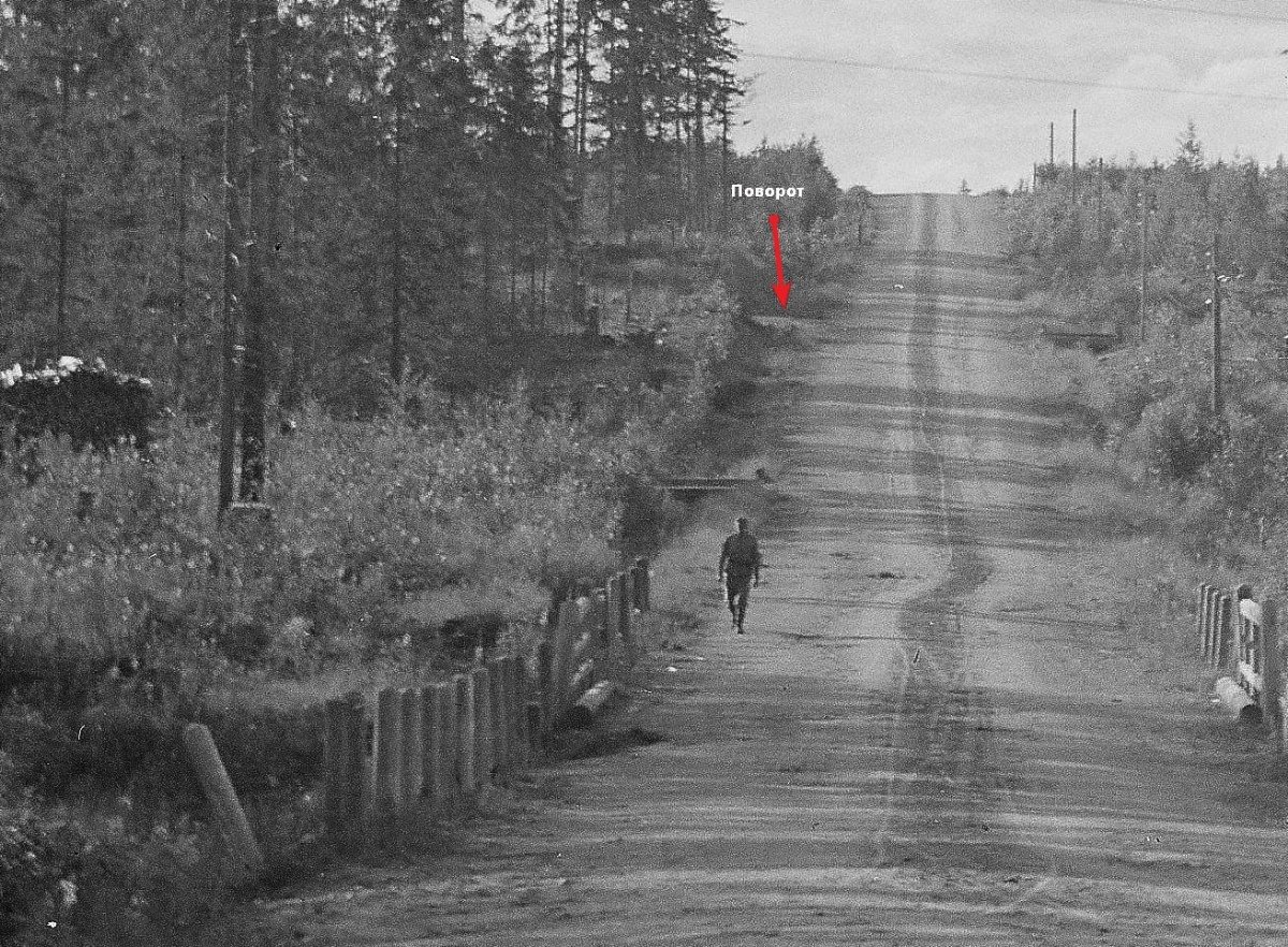 Вообще фотосценка похожа на искомый перекресток с отворотом на Лампу. Только локальные перепады высот непривычно выглядят: ныне мост (неоднократно разрушенный и столь же неоднократно восстановленный только на моей памяти) через ручей находится явно ниже. Пологая горка на горизонте на танковой - похожа, но бодрый подъем после моста в сторону отворотки к Лампе - ныне очень крутой, после дождя поди заберись на технике, а на фото его почти нет