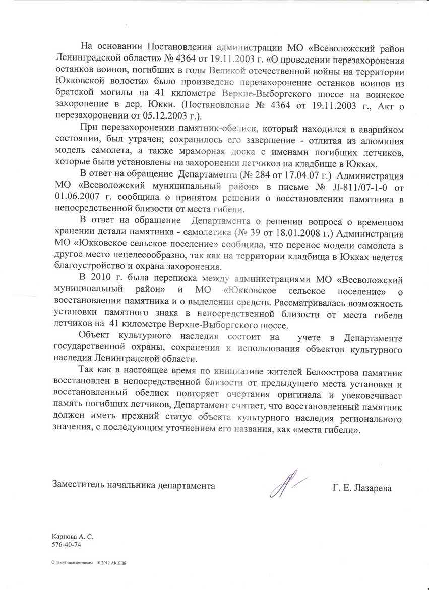 Сегодня получил ответ из обл. "КГИОП" см. ниже.краевед эксперт писал(а):25 сентября был в архиве областного "КГИОПа" с целью ознакомления с внутренней деловой пререпиской, по сносу и перезахоронению погибших летчиков, связанной с расширением Выборгского шоссе. Также взял, под расписку с предоставлением паспортных данных, для сканирования у себя дома 9 фото памятника, сделанных до сноса. В "КГИОПе" нет сканера.