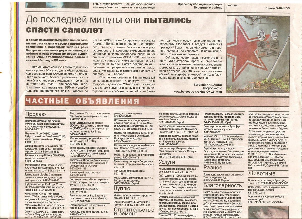 Корреспондент газеты "Сестрорецкие берега" житель Сестрорецка Евгений Нифашев написал статью в №19 от 23 сент. 5 окт. 2012г. о гибели летчиков Басова и Деревяшкина во время тренировочного полета в сентябре 1982 г. (см. прикреплена ниже).
