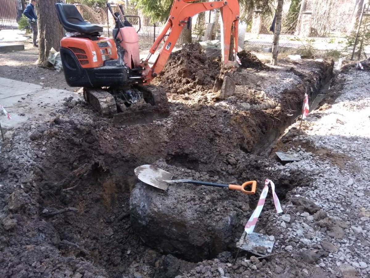 Дренаж 80 метров в ограниченном пространстве. С одной стороны большие витрины, с другой сложенная тротуарная плитка. Для разморозки грунта использовали "тепляк".