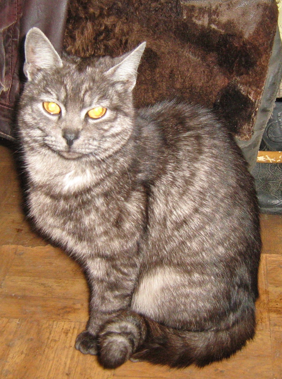 В начале июня 2012 в п. Белоостров (Сад-во Композит-1) прибилась (найдена) кошка. Небольшая, полудлинношерстная, дымчато-полосатая (спинка темно-серая, подшерсток светлый, почти белый), глаза ярко-оранжевые большие (Очень похожа на метиса британца), лапы длинные. На вид не больше года (может быть и 1,5, тело длинное, но кошка очень худая)