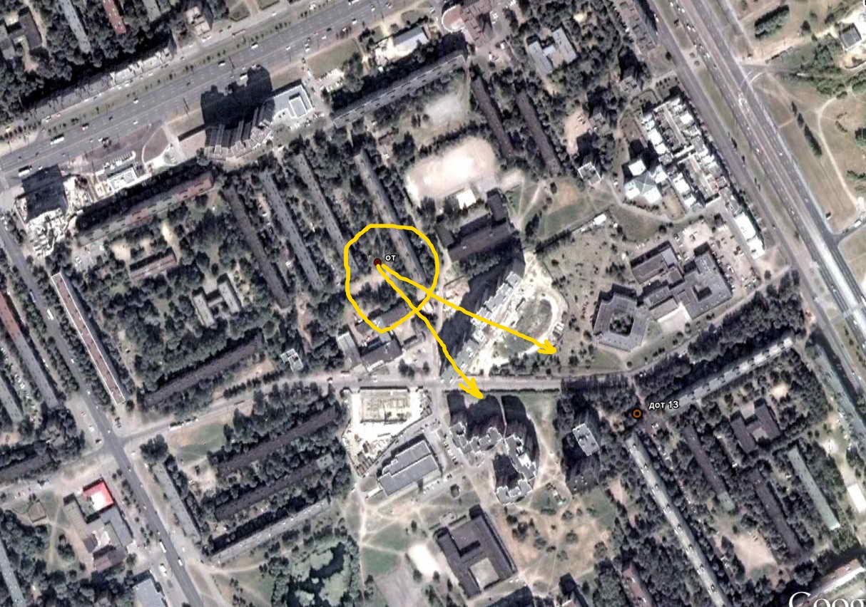 А почему в этих местах вообще что-то должно быть? Отвечаю – потому, что рядом на возвышенности был аэродром. И на западных склонах этой возвышенности вполне можно было построить доты-дзоты для обороны аэродрома. И вот точка 3. Трехсотпроцентное попадание! Обхожу дом 71 корпус 1 по Тореза и захожу во двор в надежде увидеть двухорудийный АПК (шутка юмора). Нет там ничего . Только двор нового дома, уставленный машинами. Вы будете смеяться , но идет бабушка… Итог – три бабушки, допрошенные порознь в течение пяти минут подтвердили, что на месте построенного дома до начала строительства был дот. Попадание триста процентов (был бы дот, было бы четыреста). Стоял, засыпанный грунтом, с «дыркой». Куда смотрела дырка, не помнят.