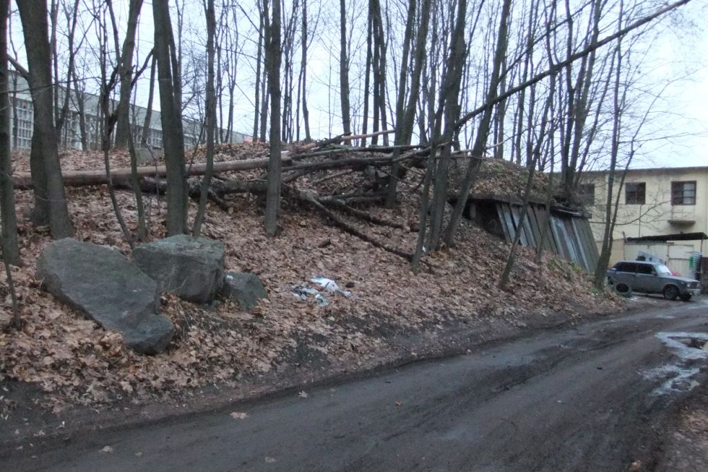 Общий вид бункера. Обваловка частично снята. Являлись ли гранитные глыбы частью укрепления - сказать трудно, но больше им тут вроде и делать нечего. За забором расположен автосервис.