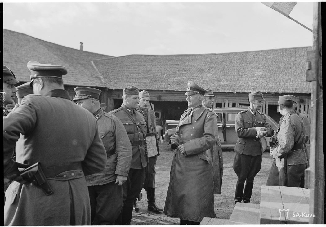 Простим Е.Балашову ошибку в номере дивизии (18-я, а не 3-я). Сам факт, приведённый им, весьма примечателен. В Са-куве можно найти и другие фотографии с этим домом, например эту, где Паяри снят со своим штабом Балашов пишет также, что 18 августа 1942 г. дом Суокаса посещал проездом с инспекционной поездкой Маннергейм. Правда, этого фото в Са-куве я не нашёл, поэтому привожу фото из книги
