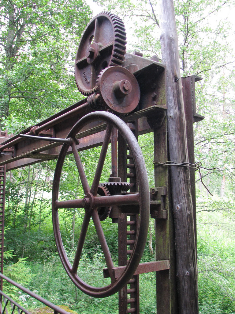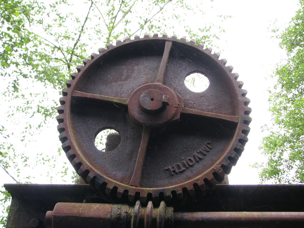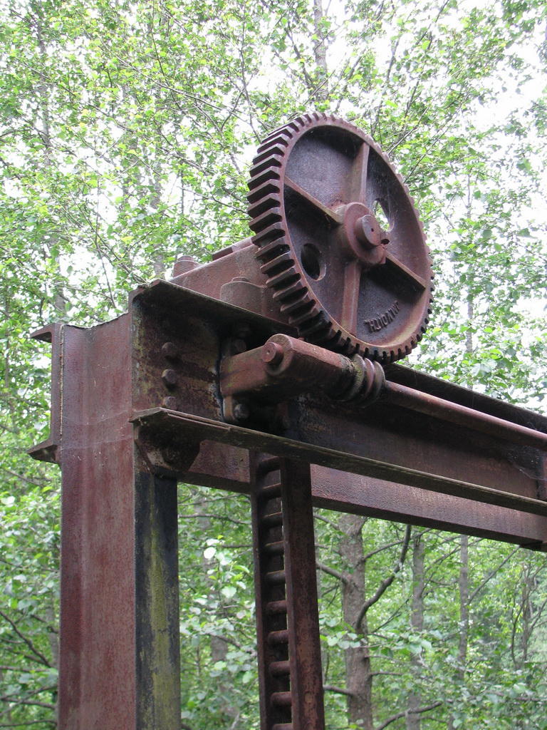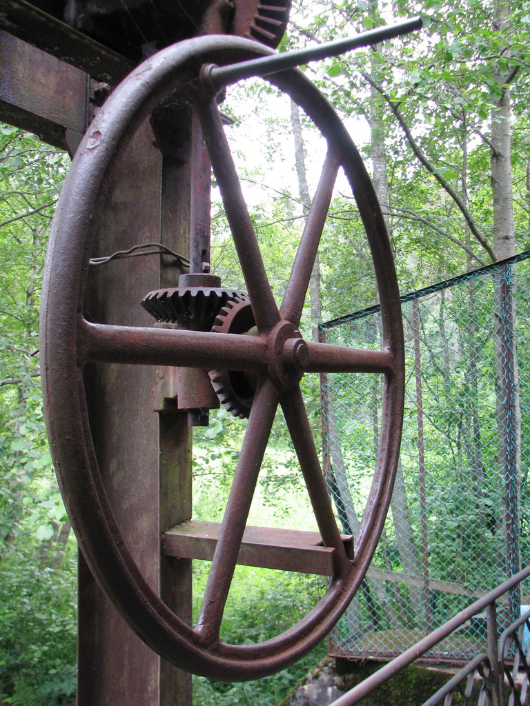 Затворный механизм, регулировавший подачу воды на турбины. Находится непосредственно перед машинным залом. На месте машинного зала стоит деревянный дом с изображений выше. Сам затвор деревянный. На шестерне клеймо JM Voith - немецкое производство.