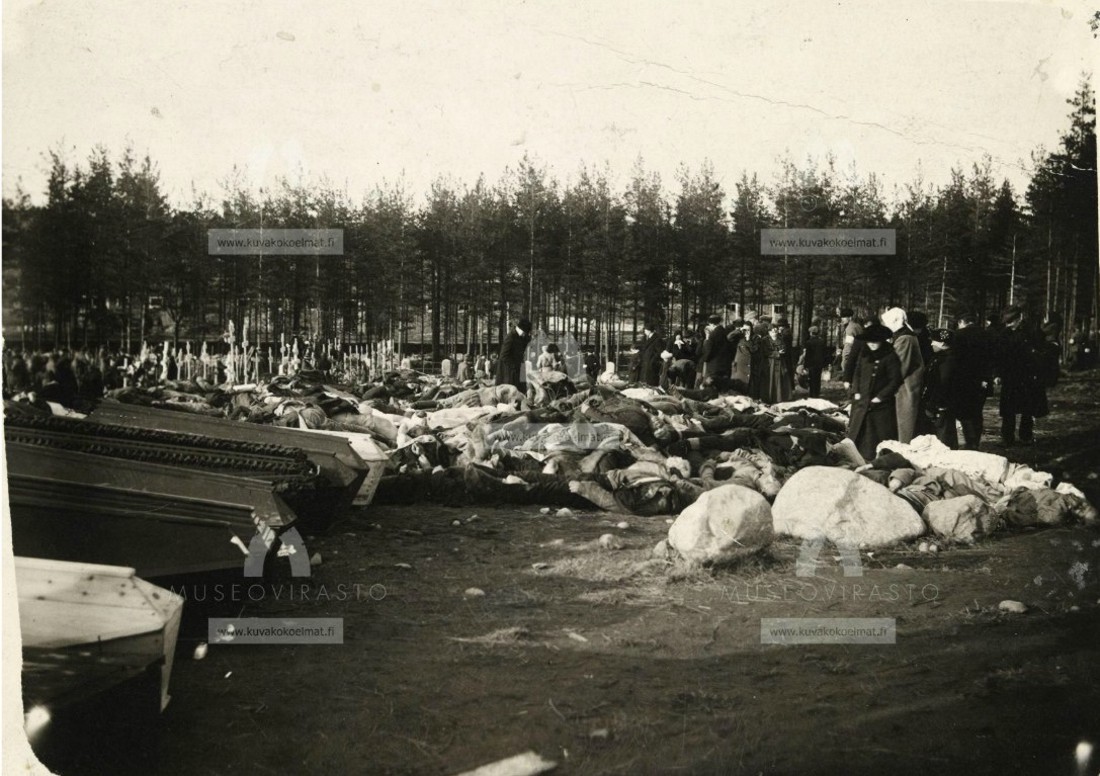 Несмотря на то, что фразу "Тела белых были уже собраны в усадьбе Маанселькя" автор статьи отнесла к фотографии с гробами и телами, что, казалось бы, даёт основание считать, что на фото - похороны в усадьбе, мне кажется, что это кладбище, то же самое, что и на фото 1921 г. Видны могилы, надгробия, за деревьями - окружающая кладбище стена. Да и с какой стати хоронить в усадьбе, если можно было нормально похоронить на кладбище? Единственный аргумент в пользу захоронения в усадьбе - ни чем не подкреплённые утверждения местного краеведа при обсуждении статьи.